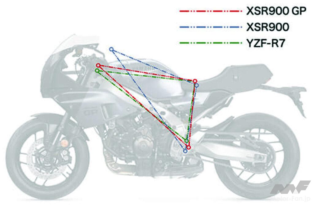 注目すべきはキャスター/トレールが、25度/108mmだったXSR900に対して同GPは僅差ながらフロントフォークが寝かされ25度20分/110mmに。全長と軸距の5mm差はこれに起因していると思われる。