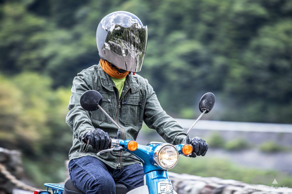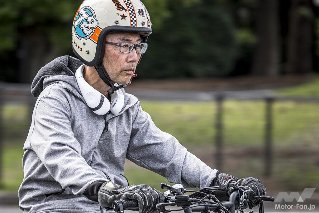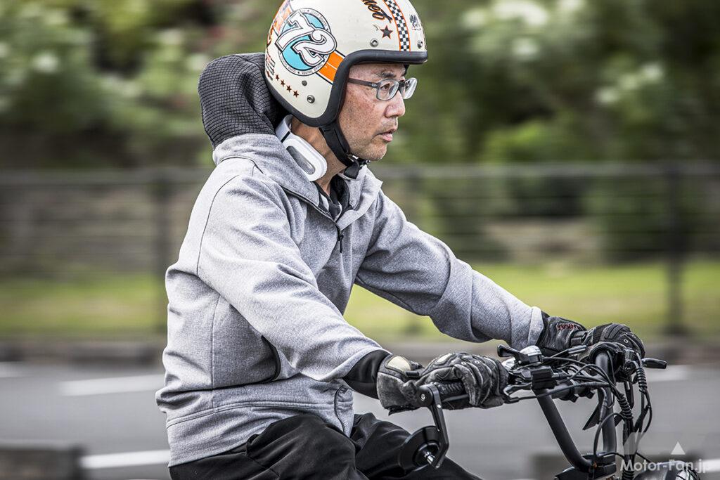 風量を強に設定してスイッチをONして走行してみるが、うーん、微妙……。扇風機から噴出される温風が、首元で走行風にかき消されるイメージ。涼しさを感じるのは、むしろ走行風そのもので、首元自体はプラスチックボディが煩わしく感じる。