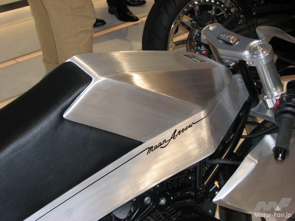横浜ホットロッドカスタムショーを主催するなど、日本のカスタムカルチャーを横浜から発信してきたMOONEYESは、R12のカスタムプロジェクトに際して、ボクサーエンジンの造形を際立たせつつ、古のMOONEYESのレーシングマシンが湛えていた「スピード感」を表現。スタイリングはどこか前衛的で、低く構えたボディが速さと力強さを見事に表現しています。前後ホイールはムーンディスクをセット。しかもブレーキシステムやホイールハブとの干渉を避けるため、車体右側のムーンディスクは絶妙にアールを描いています。さらにフェアリングは、MOON Arrowという車名に相応しいスピード感を曲面構成で見事に表現しています。