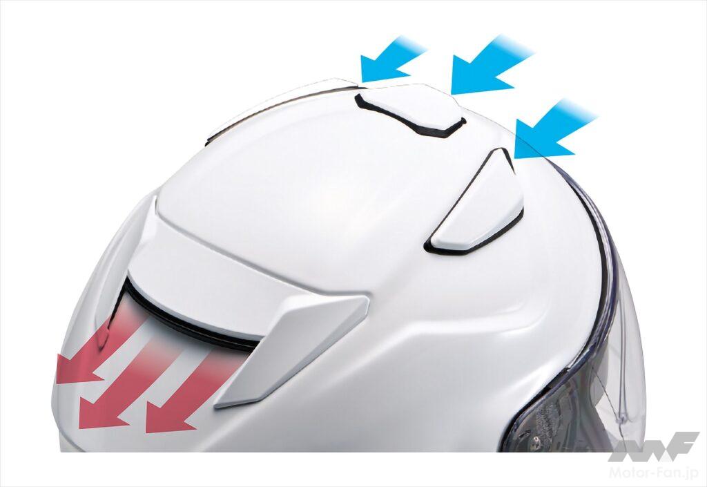 快適性の大きなポイントとなるベンチレーション機能も進化。アウトレットホールは従来モデルから1か所増え、3か所に配置。また、自社大型風洞設備での検証により排気効率を高めるパーツ形状を割り出し、100km/h相当の環境下において従来モデル比約70%*の大幅な排気性能向上を実現している。(自社風洞設備にて測定した参考値)