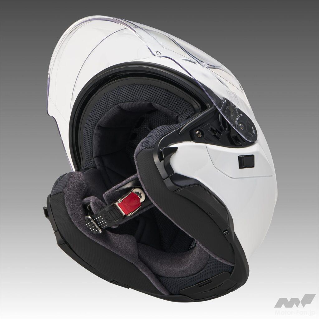 さらに、厚手のグローブのままでチンストラップの締結と解除が可能なマイクロラチェット式チンストラップを採用。耐久性に優れたステンレス製で、締結時に2か所のツメで保持する安全設計はそのままに、コンパクト&軽量に進化。ストラップ部分には高強力・高弾性の高機能繊維を編み込むことで強度を確保しながらもスリムになり、締結時のフィット感を高めている。