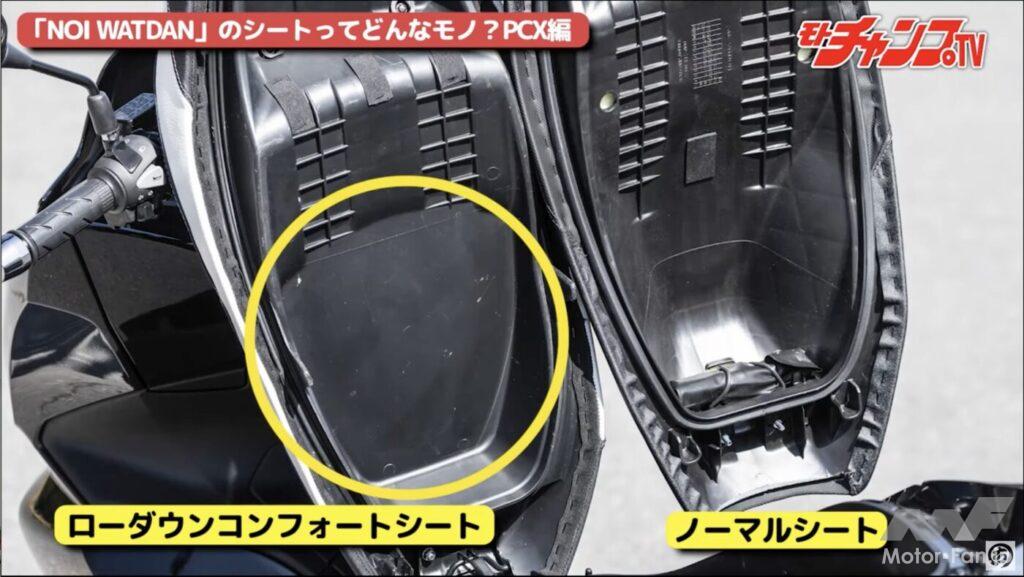 まず紹介しているのはホンダPCX用として販売されているローダウンコンフォートシート。実際に装着したデモ車を見ながら解説していて、最大の特徴はシート高が3cm低くなることとデザイン性の高さだ。こうして見るとノーマルのシートより明らかに着座位置が低くなっているとわかる。では実際跨るとどうなのだろう。