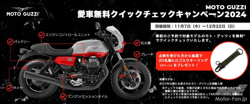 このキャンペーンは、ウィンターシーズンでも安心してお客様がモト・グッツィにお乗りいただくために、モト・グッツィ正規販売店が特定のチェック項目を無料で点検する。さらに、このクイックチェックキャンペーンを利用した方の中から抽選で20名様に、MOTO GUZZI ロゴ入りキーチェーンをプレゼント。