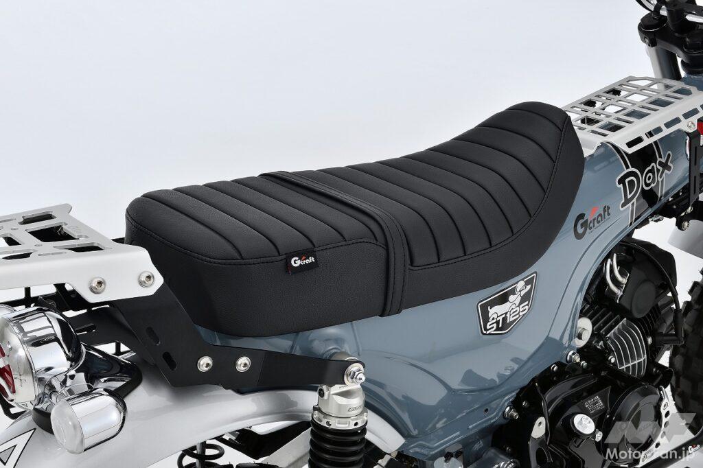 シート後端にはエンボス加工でGcraftロゴを押し、タグも専用品を縫い付け。シートフォームは純正から20mm下げており、足着き性を向上しつつ、適度なコシを残しているのが特徴。