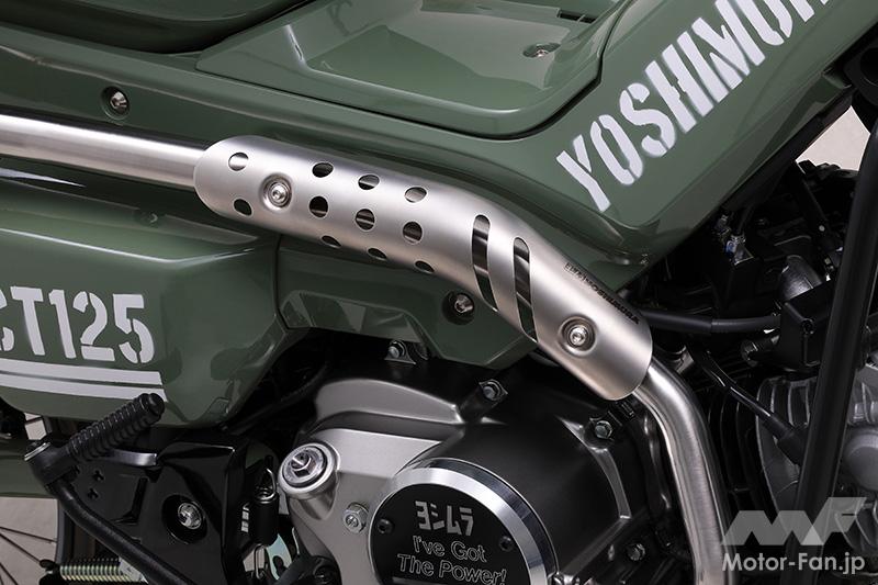 CT125ハンターカブのスタイリングに馴染む、トラディショナルな丸形サイレンサーを採用した「GP-MAGNUM」。ヨシムラオリジナルのディンプルリベットや肉抜きリベットバンドなど、随所に個性が光るパーツで組み上げられている。