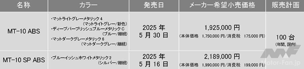 今回発表された「MT-10 ABS」および「MT-10 SP ABS」の2025年モデルは、YSPおよびアドバンスディーラーのみで販売される「ヤマハモーターサイクル エクスクルーシブモデル」となる。購入を検討する場合は、ヤマハ発動機販売のWebサイトに掲載されている取扱店への問い合わせが必要だ。