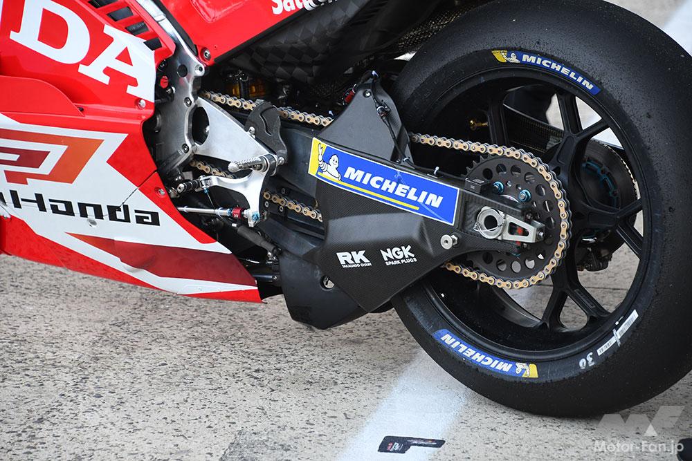 過去にもホンダはカーボンスイングアームを投入していたが、現在はアルミニウムのスイングアームを使用している。今回再びテストしているカーボンスイングアームについて、ねらいは「聞いていない」ということだった。ただ、ここ数年、ホンダが苦しんでいるグリップの向上とリアの安定性改善をねらっているのではないか、とのことだ。
