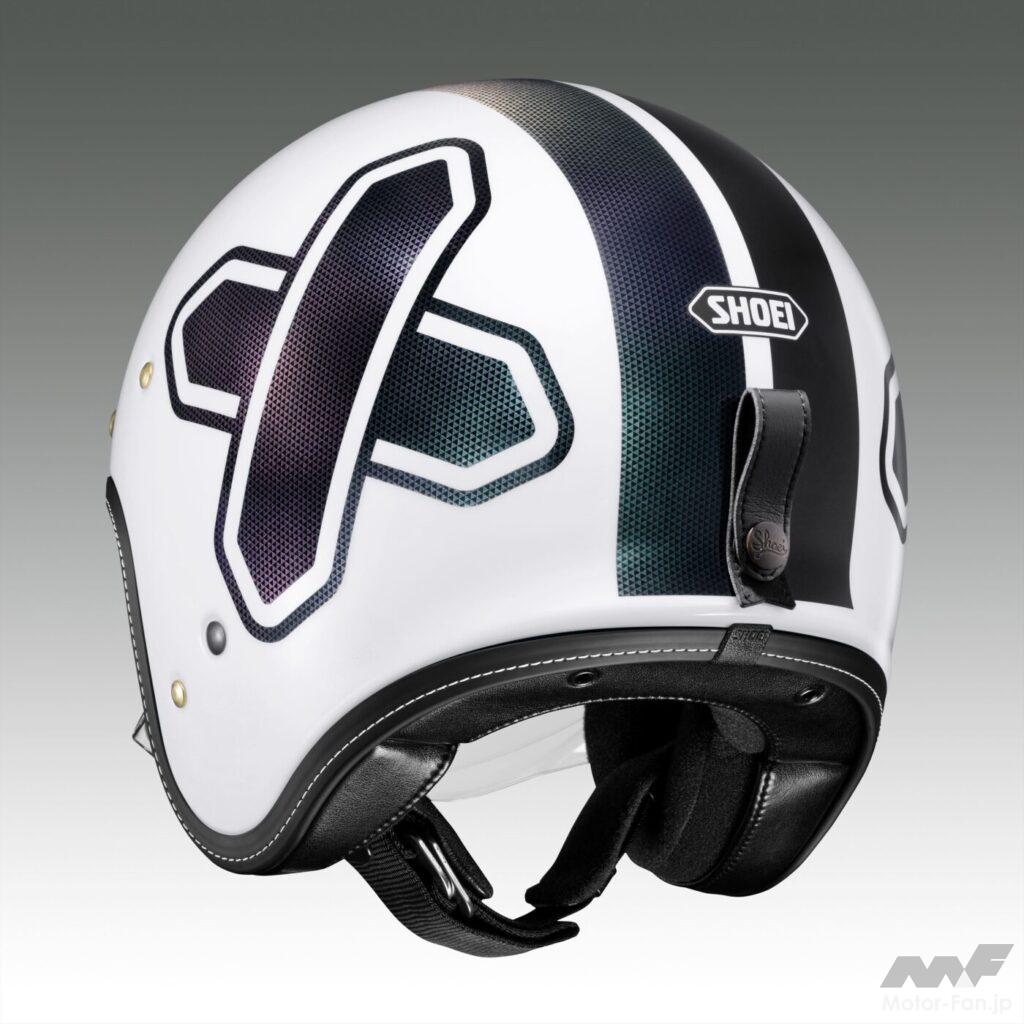 コンパクトさを重視したシェルデザインは、オープンフェイスのオーソドックスなスタイルを採用しながらも後頭部にダックテールシェイプを採用。クラシカルな中にも個性を求めるJ・Oならではのスタイルに貢献している。後頭部にはステッチ付きのゴーグルバンドを装備。SHOEIロゴが刻まれたスナップボタンを採用し、デザイン上のアクセントとしている。