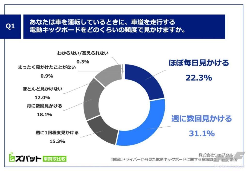 株式会社ウェブクルーが運営する比較サイト「ズバット 車買取比較」が、自動車ドライバーを対象に電動キックボードに関する意識調査を実施した。調査対象は週に3日以上運転し、かつ電動キックボードを見かけた経験のある札幌、東京23区、名古屋、大阪、福岡の都市部在住の男女1088名。結果によると、53.4%が「週に複数回」電動キックボードの車道走行を目撃していると回答し、そのうち22.3%は「ほぼ毎日見かける」と答えており、都市部での電動キックボード普及が加速している様子がうかがえる。