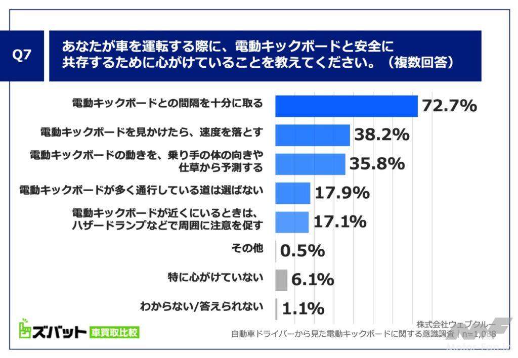 一方、調査ではドライバー自身が心がけている安全対策についても尋ねている。最も多かったのは「電動キックボードとの間隔を十分に取る」で72.7%。以下「速度を落とす」38.2%、「乗り手の体の向きや仕草から動きを予測する」35.8%と続いた。危険を避けるために積極的に距離を取り、慎重に運転している様子がうかがえる。