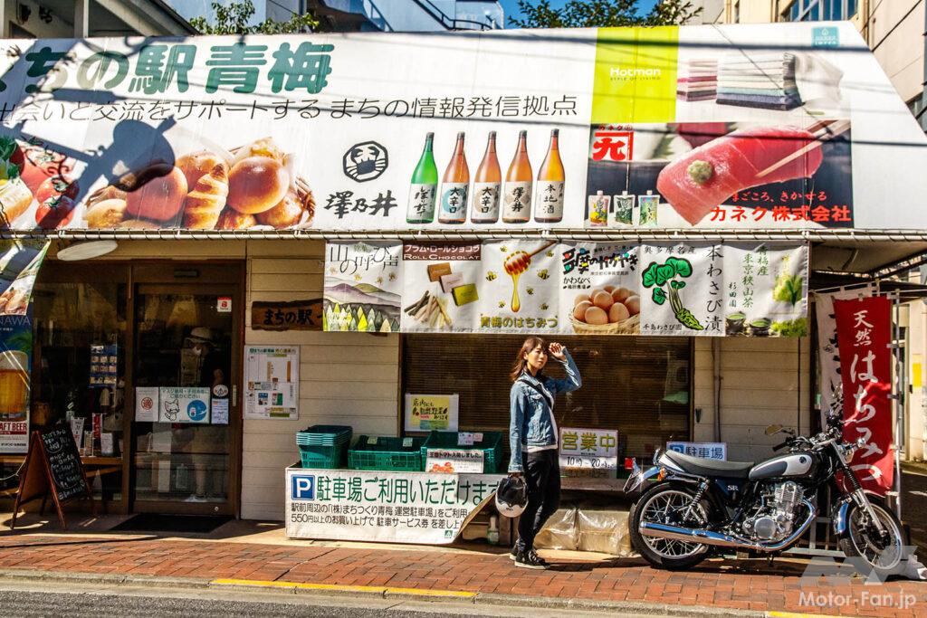 青梅駅前に建つ「まちの駅青梅」は、地域の情報発信の拠点として2016年にオープン。青梅の新鮮な野菜や人気店のパン、地酒、オリジナルグッズなどを販売しています。提携の駐車場もありますが、バイクで訪れた際はお店の横にとめてOKだそうです。