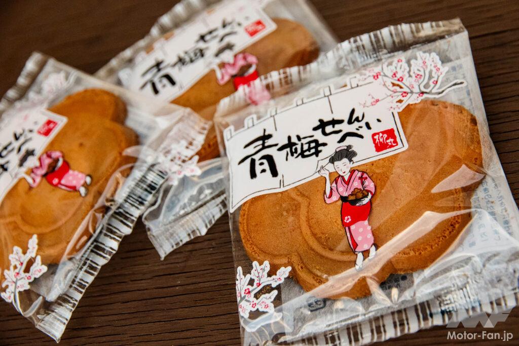 梅の花をかたどった「青梅せんべい」は青梅の定番おやつ。主な材料は小麦粉・卵・砂糖で、さっくりとした食感と優しい甘さが特徴です。今回訪れた柳丸工場直売店では、青梅せんべいのほかにも焼団子やカステラバームなども販売されていました。