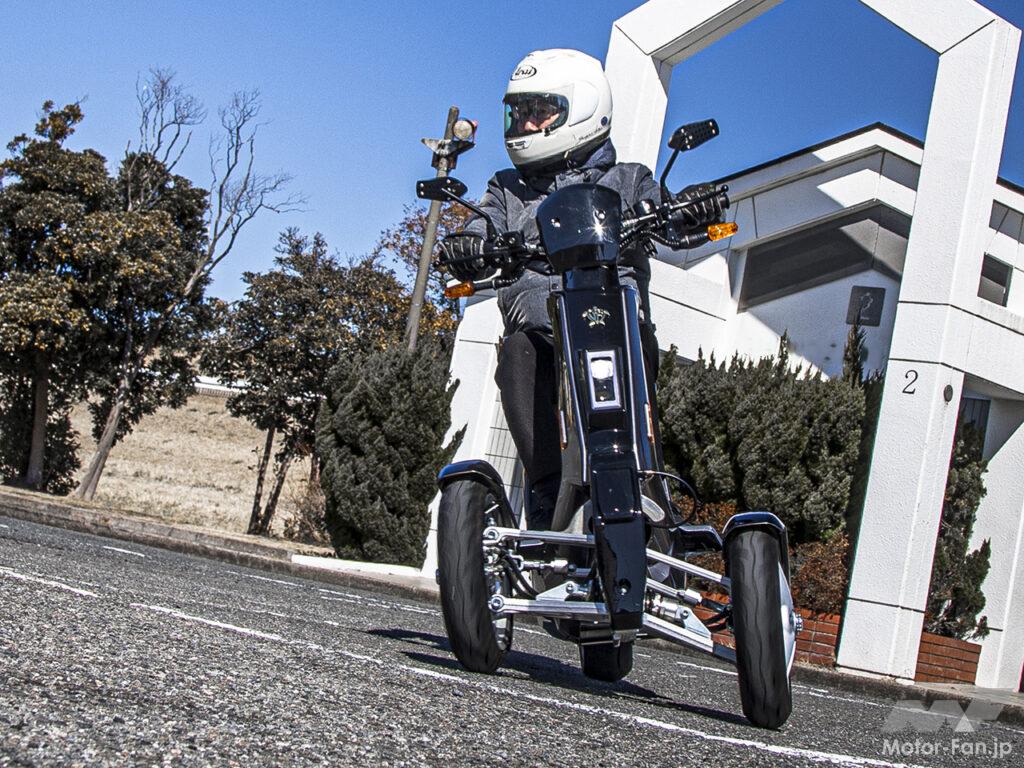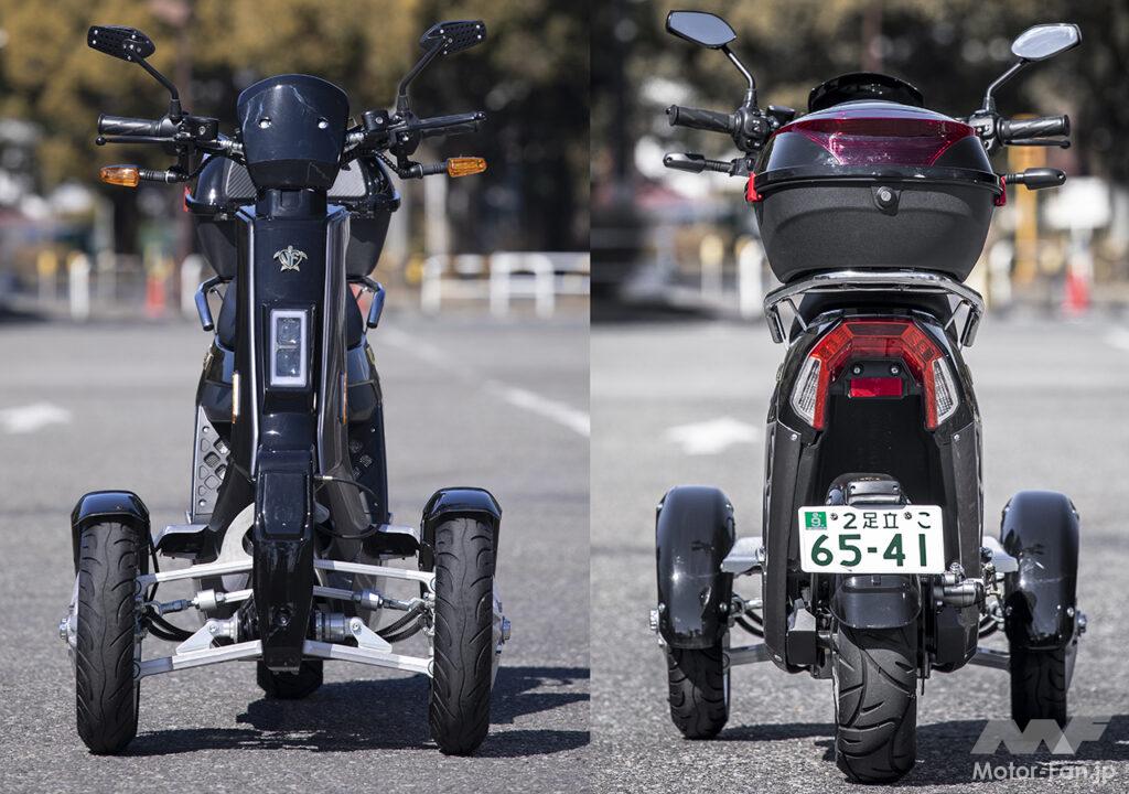 身長173cmの筆者がまたがってみると、適度なハンドルとシートの高さにより、ポジションは長距離走行も苦にならない、極めてナチュラルなもの。停車時は2輪と同じく、片足を地面に着くことになるが、足着き性は申し分はない。車体がコンパクトかつ軽量(車重97.5kg/バッテリー含む)なこと。また前後に小径の12インチホイールを採用しているため、取り回し性もGOOD。