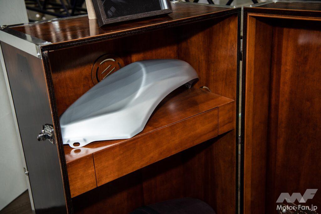 外装セットは2022年8月の発売予定となっていて、予定価格は19万8000円(消費税込み)。燃料タンクは一体ではなく左右サイドと上側、合計3枚のパネルを被せる構造。高級感あふれるサンバースト塗装は、素材がアルミであることからヘアライン仕上げが透けて見えるハーフトーン技術と組み合わせてある。バイク用としてはあまり見かけない色合いのシートは本革調のもので、確かにクラフトマンシップを感じさせる。さらに専用ロゴが装備されたサイドカバーがセットの内容になる。