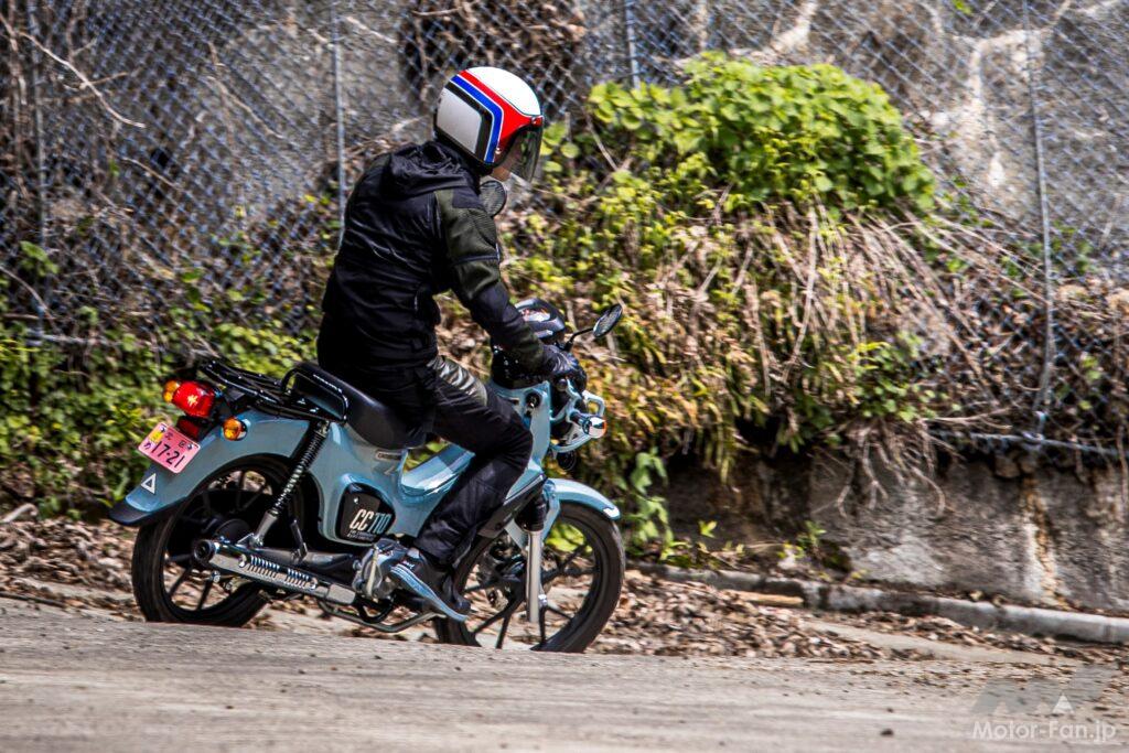 具体的には、クロスカブは17インチのフロントホイールが18インチぐらいになったかのような、大らかな舵角の付き方となっており、軽い入力でスイッとクイックに向きを変えるスーパーカブとは対照的だ。しかも、サスストロークが長いことで車体のピッチングが分かりやすく、グリップ力の高い標準装着タイヤ(IRC・GP-5)と相まって、コーナーの進入から2次旋回に至るまで、まるで軽二輪クラスのような安定性と安心感がある。