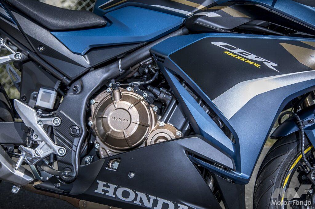 CBR400Rの心臓部は、水冷DOHC4バルブ直列2気筒エンジンです。低中回転域のトルクの向上と力強い加速、そして心地よいスムーズな吹け上がりを実現するため、バルブタイミングおよびリフト量、インジェクターの最適化を図っています。さらに吸排気効率を高めることで吹け上がりの鋭さと力強いトルク特性の実現にも結び付けています。最高出力は9000回転で発生し、最大トルクの発生回転に至っては7500回転となっていて、スポーツバイクでは常識的な高回転型ではありません。スペックで性能をアピールしていないのです。実際に走ってみれば理解できますが、極低回転域から粘り強いトルクで車体を押し出し、そしてアクセルを開ければ抵抗なく吹け上がって狙い通りに加速していく。そんなパワーフィーリングなのです。つねにライダーに主導権があるエンジン特性は、走らせているという喜びを実感できて楽しいものです。しかもパワー的にも公道走行に不足はないのですから、日本の道路環境を考えれば十分な性能を有しているといえます。先ほどサーキット走行は考慮していないといいましたけど、これならサーキットのスポーツ走行だって十分に楽しめると思いました。