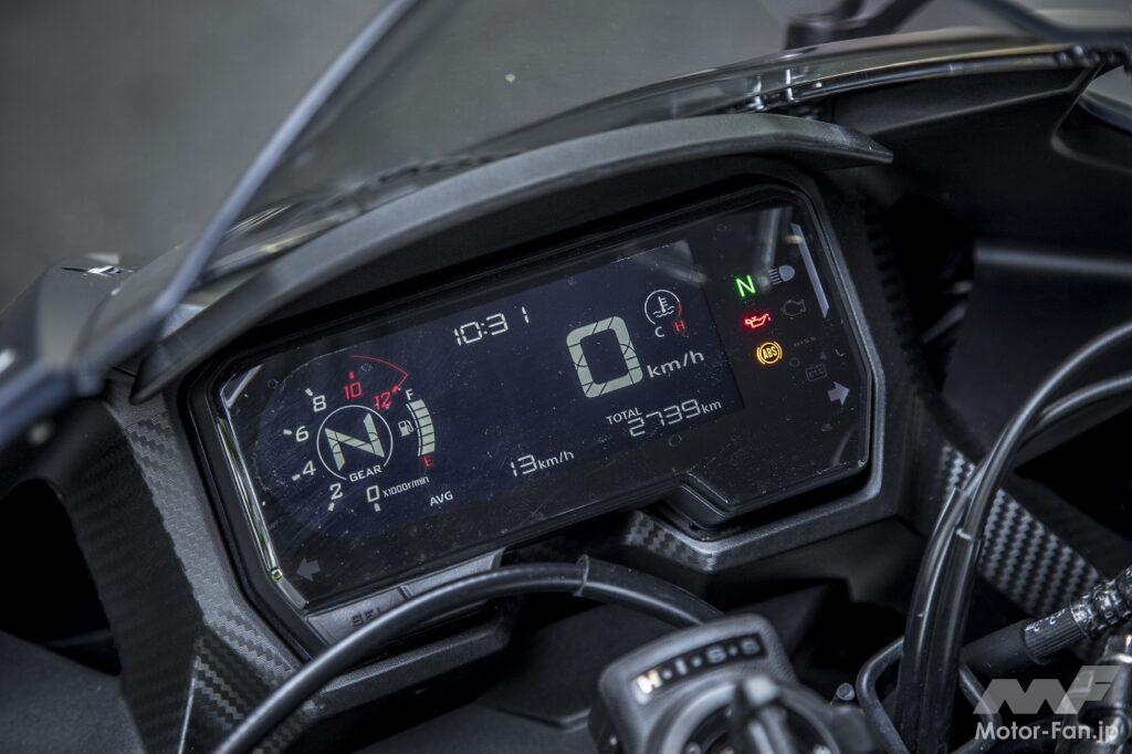 始動すると、マフラーから軽やかなサウンドが放たれます。音量は十分に抑えられていて、ボディスタイルのイメージからはかけ離れた印象さえある、悪い言い方をすれば、なんとも頼りないというか、迫力に欠ける排気音です。でもサーキット走行やレース使用をメインにしたわけじゃなく、あくまでも一般公道での使用を目的にしたロードスポーツバイクなので、こうしたサウンドが正解なのかもしれません。