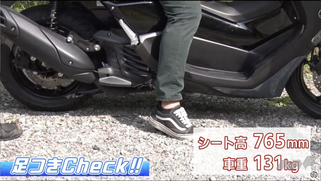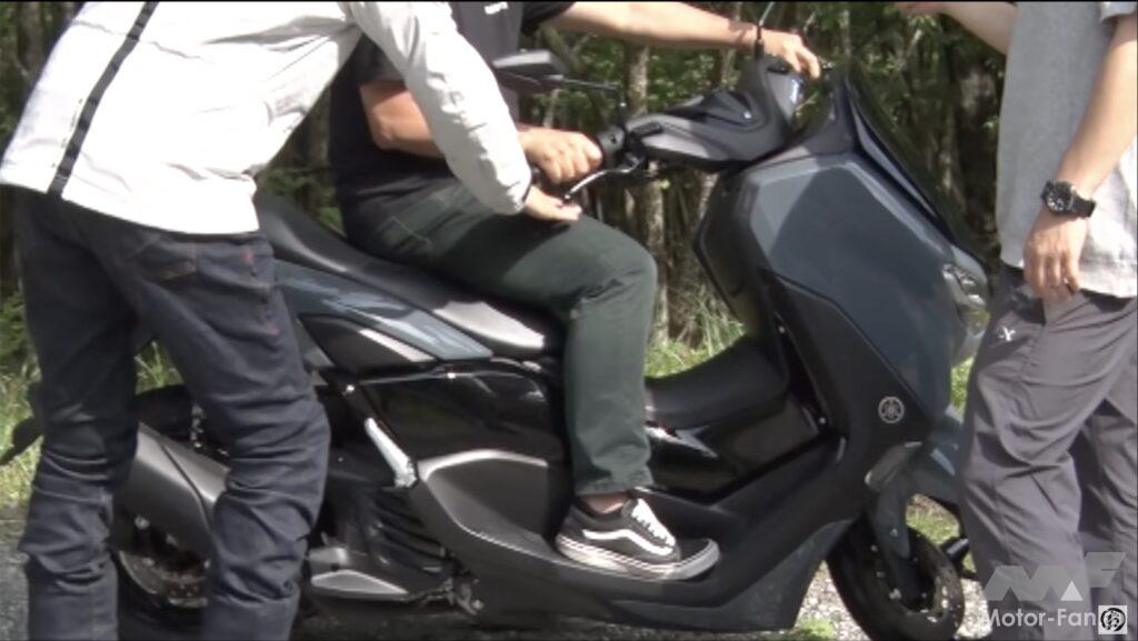 新型NMAXの足つき性はどうだろう。高身長のケニー佐川だと大抵のモデルで両足カカトまで着地してしまうので、今回は身長170センチの平均的日本人体型である編集部員のサンタサンが登場。NMAXのシート高は765ミリだが、両足カカトまでは着地しない。とはいえ片足だけならしっかり着地するし車両重量は131キロと軽量だから不安感はないとのコメント。気になるシート下のスペースはどうだろう。ケニー佐川のジェット型ヘルメットで積載性を試した後、サンタサンのフルフェイス型でもメットイン可能かどうか試している。ディフューザー付きフルフェイスながら、きっちり収納できた。