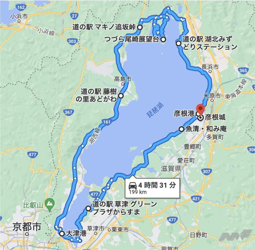 最短ルートで琵琶湖を1周した場合のモデルが下記のMAP図となります。