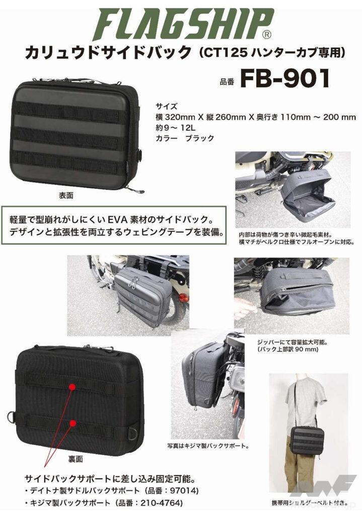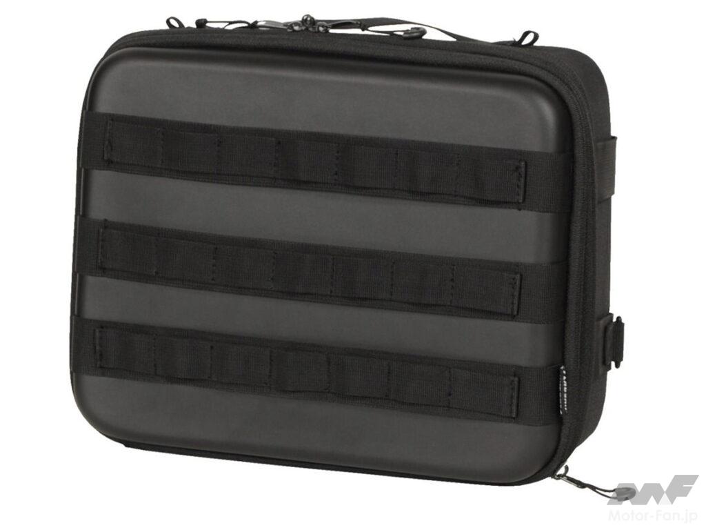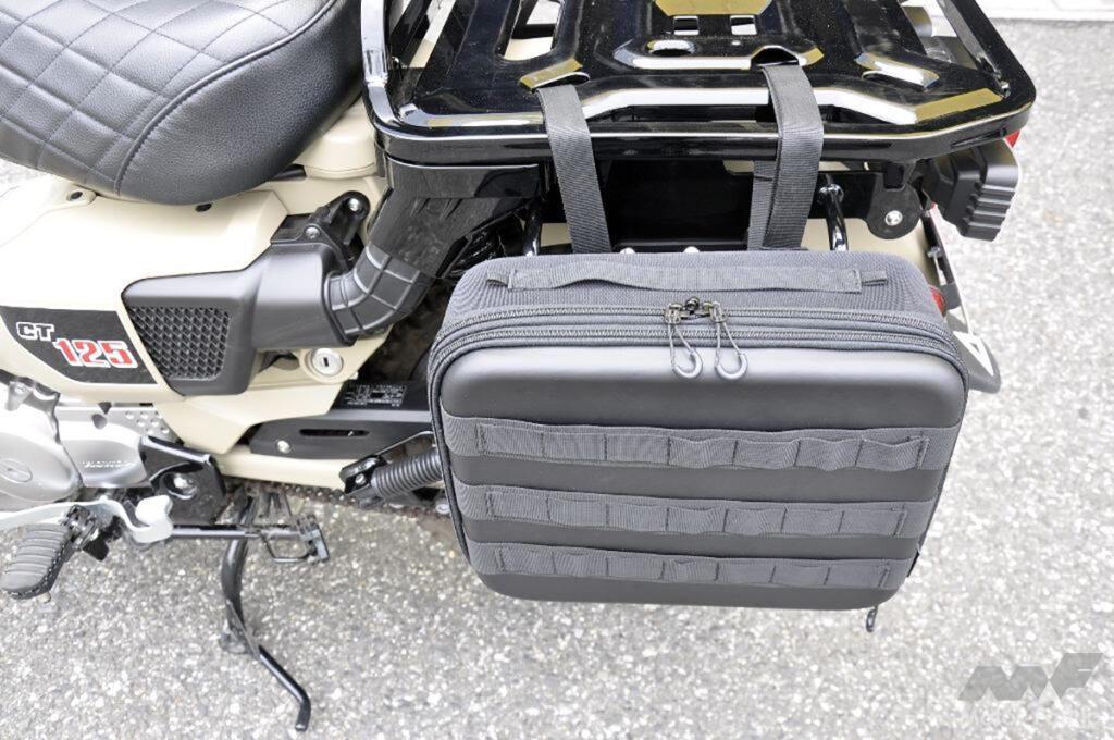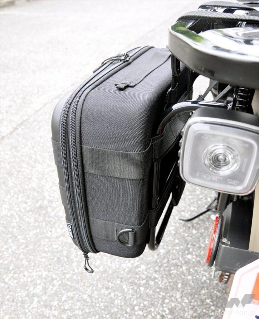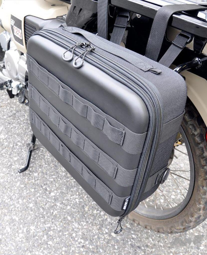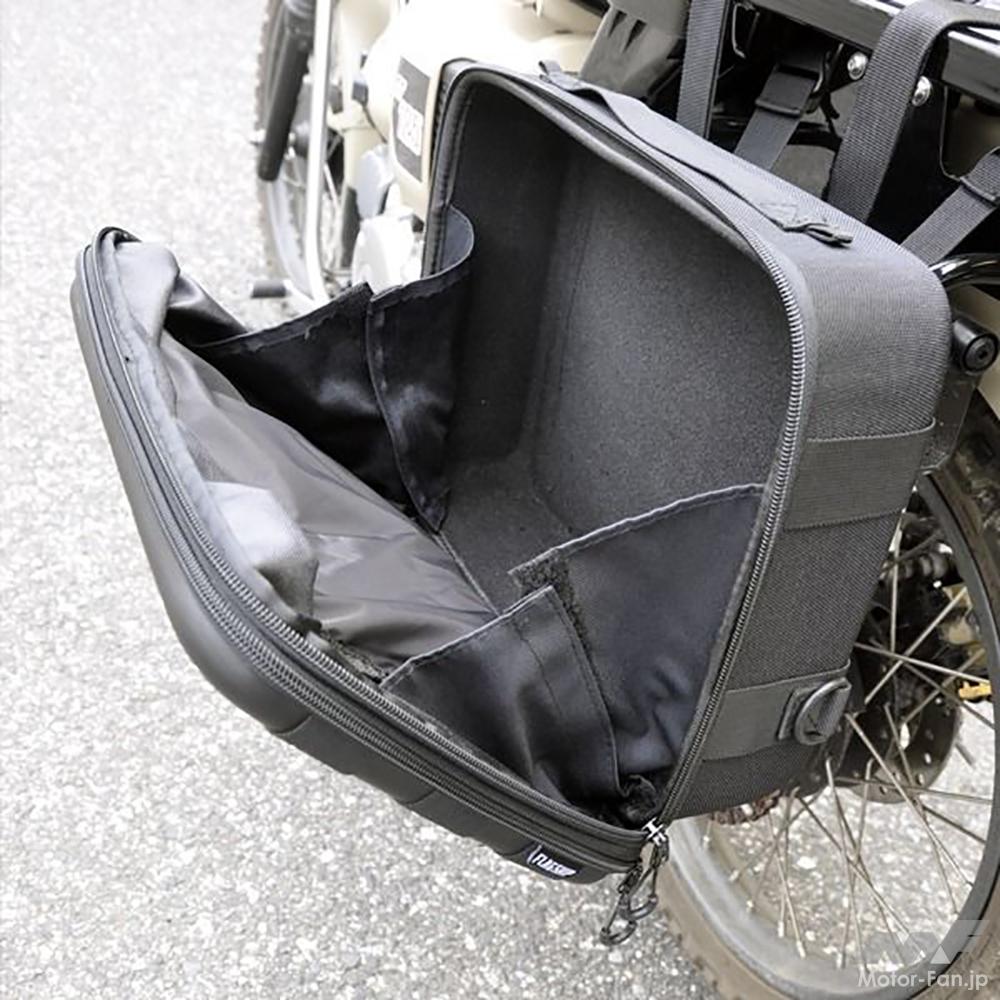 写真はCT125ハンターカブ専用に設計された、軽量で型崩れしにくいEVA素材のサイドバッグ。バッグ内部は収納した荷物が傷付きにくい、微起毛素材を採用。