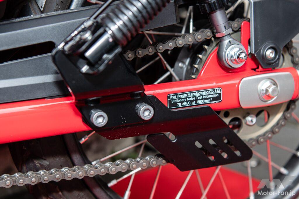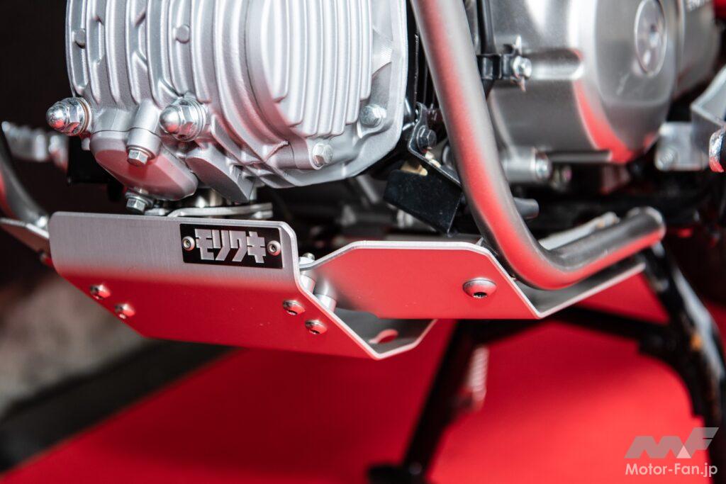 まず紹介したいのがマフラー。すでにモンスター・フルエキゾーストがラインナップされているが、今回開発されたのはルックスより質実剛健さを訴えたもの。表面処理をヘアライン仕上げとして、オフロード走行時に付いてしまうことが多い傷に対して神経質にならなくても良い製品とされているのが特徴だ。軽い傷であれば磨いて落とすことも可能だとのことなので、林道などを走る機会が多いCT125オーナーには朗報といえるだろう。現在のところ発売時期や価格は未定なので、詳しくはモリワキエンジニアリングの公式WEBサイト(https://www.moriwaki.co.jp)で確認していただきたい。