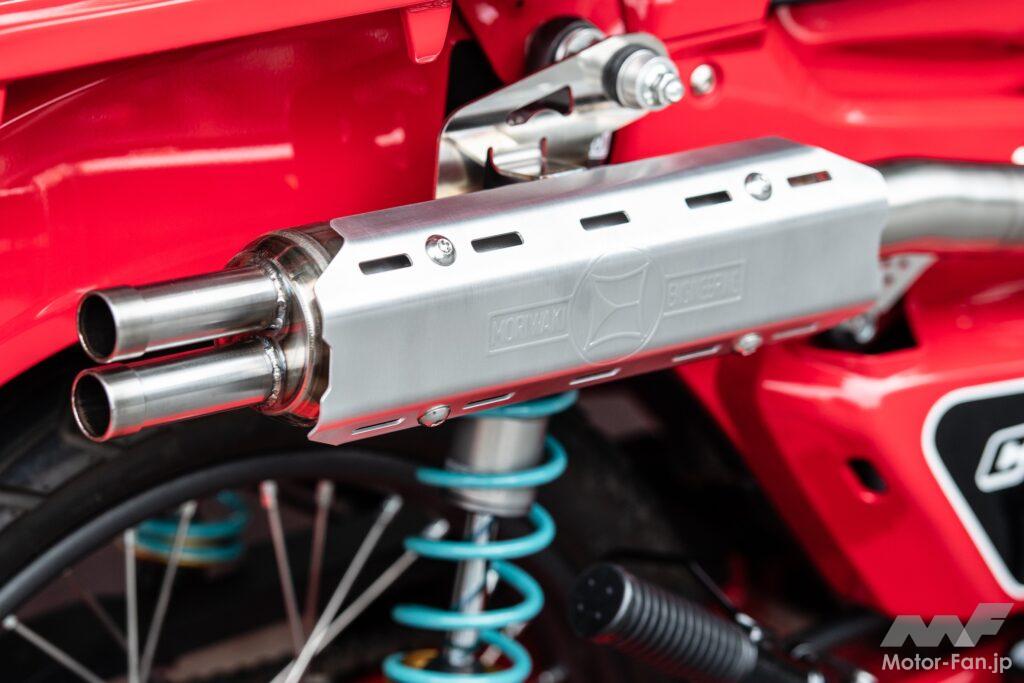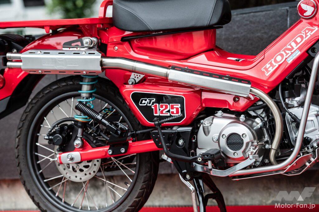 展示されたCT125にはモリワキエンジニアリングですでに発売されている製品がほぼ装着された状態だった。コンプリートともいうべきルックスなので、純正からどれだけ印象が変わるのは再確認してほしい。以下に製品を個別に紹介しよう。