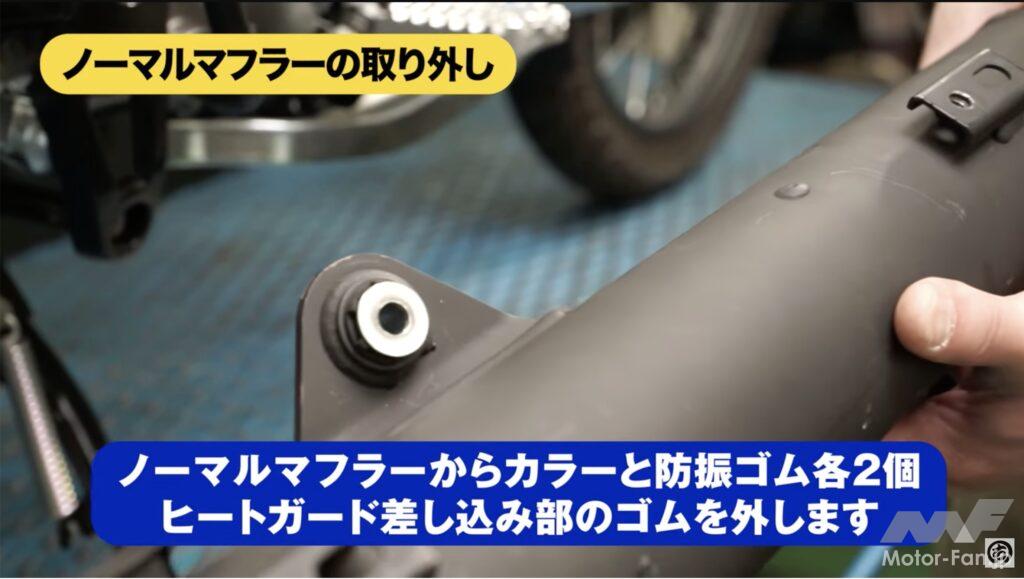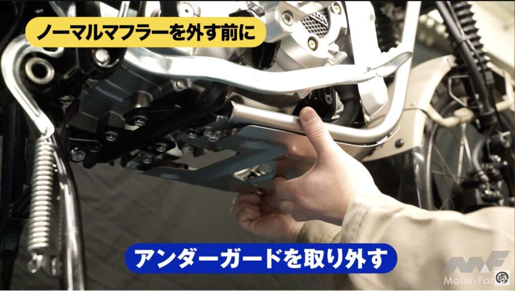 マフラーを交換するには純正マフラーを取り外さなければならない。動画では詳しい手順を紹介しているので、ここではダイジェスト的に追ってみよう。まずマフラー取り外しの準備として車体からアンダーガードとサイドカバーを外さなければならない。どちらもマフラーと干渉するための処置で、脱着時に傷がつく可能性もあるため各部に養生テープを貼ることを忘れずに。また今回の製品では純正マフラーについているヒートガードを再利用してスタイルを維持するため、マフラーを外す前にヒートガードを外している。