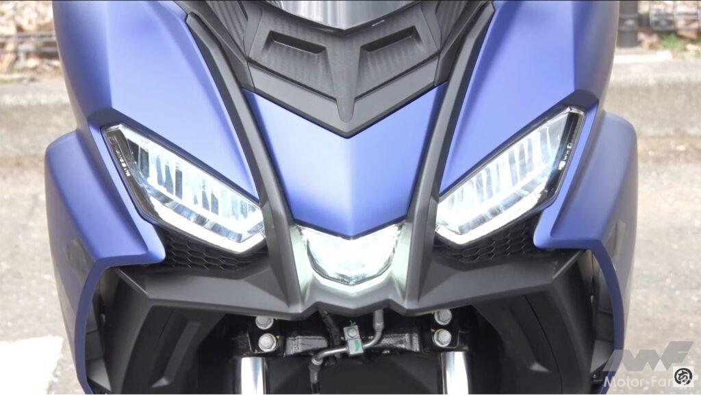 スクーターと言ってもスタイルは最近のアプリリアに共通した3眼顔を採用したスポーティなもの。ちなみに中央のライトはハイビーム専用で点灯する様子は動画で紹介されている。またアドベンチャーモデルらしくタイヤはオン・オフ両方こなせるトレッドパターン。さらにフロント14インチ、リヤ13インチとしていることも特徴だ。