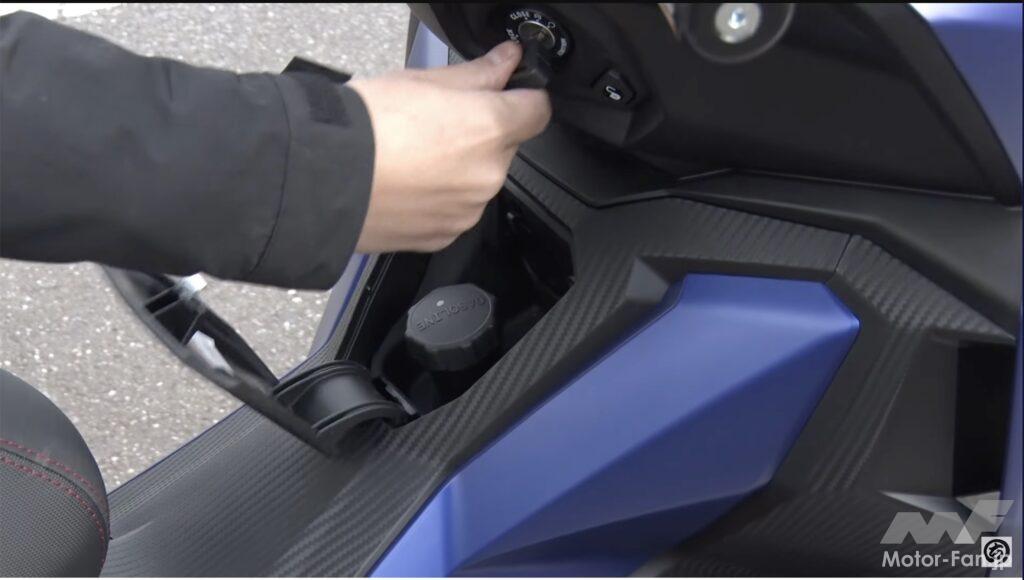 積載性や使い勝手なども動画で紹介されている。シート下にはフルフェイスが入ると説明されていたものの、実際試すと入らなかったなんてエピソードも披露している。とはいえ小物入れが充実していることのほか、給油口はキーをオンにして押し込むことで開くなど、セキュリティにもしっかり配慮されている。