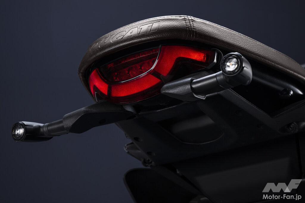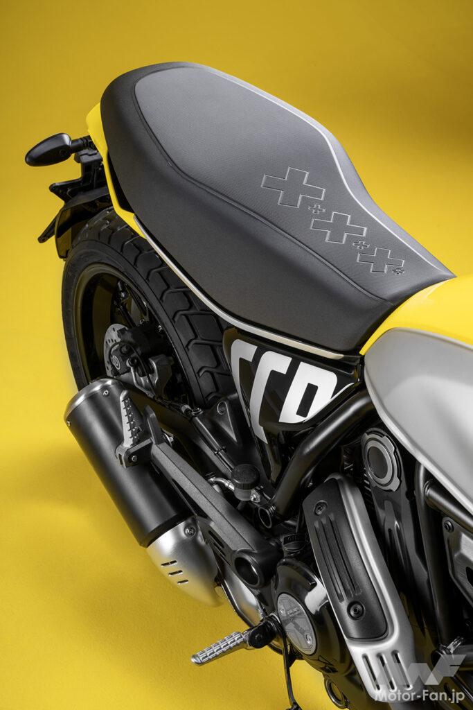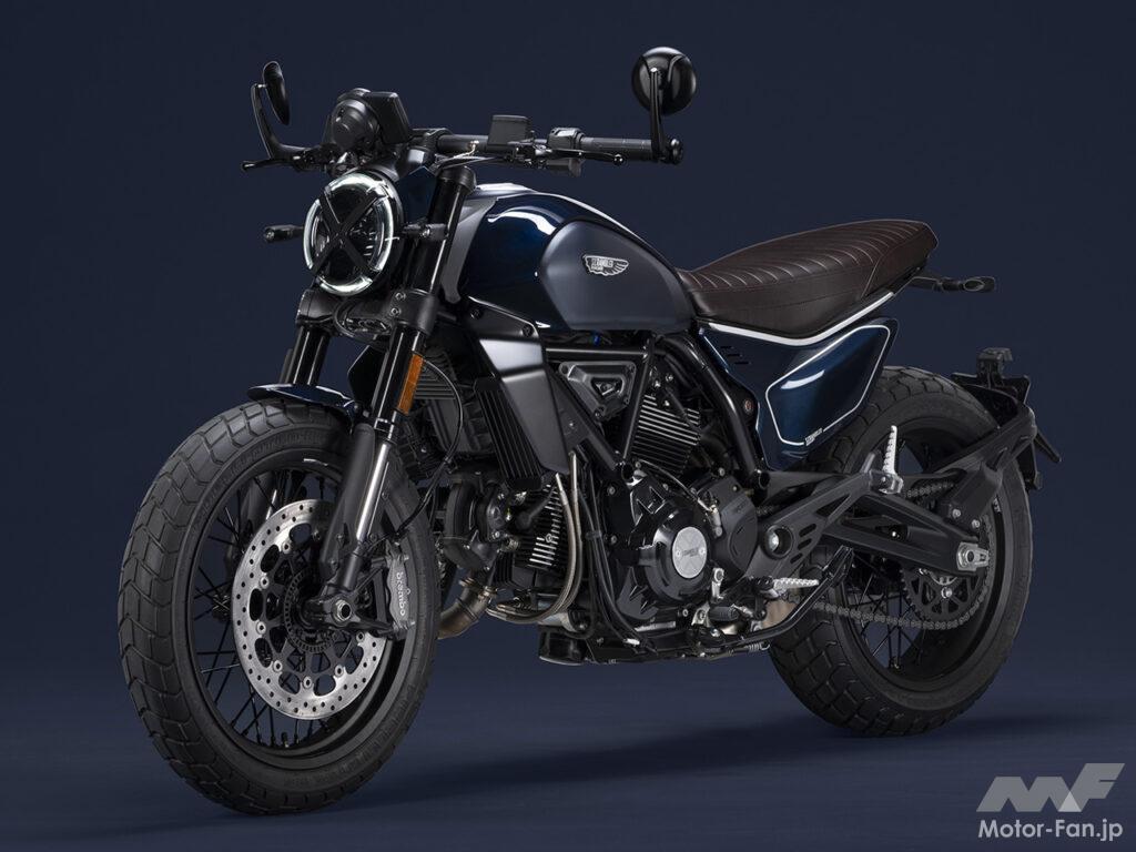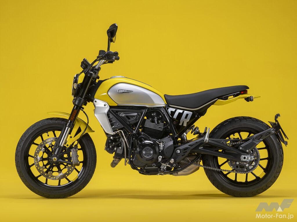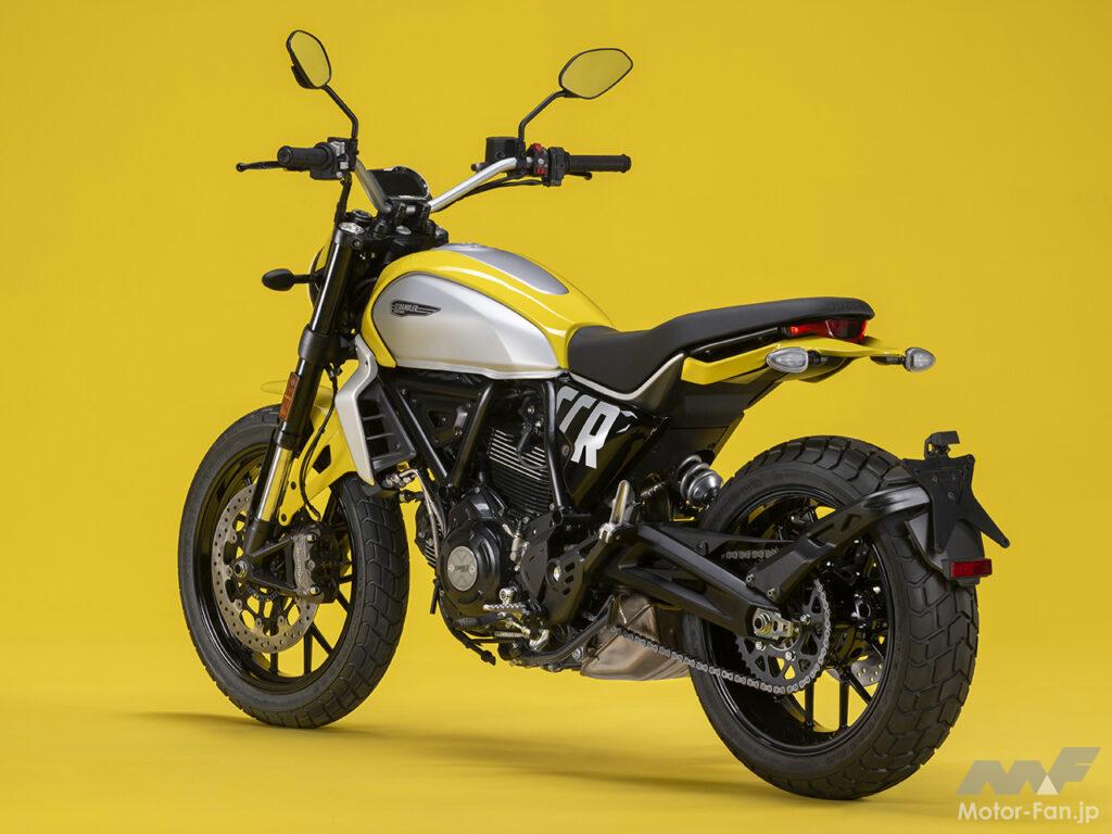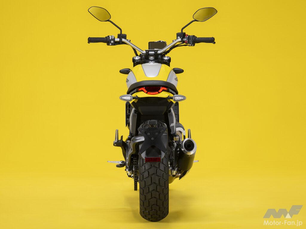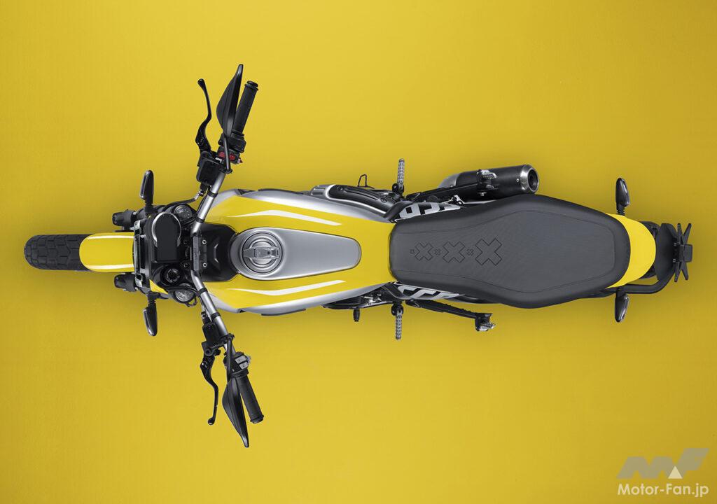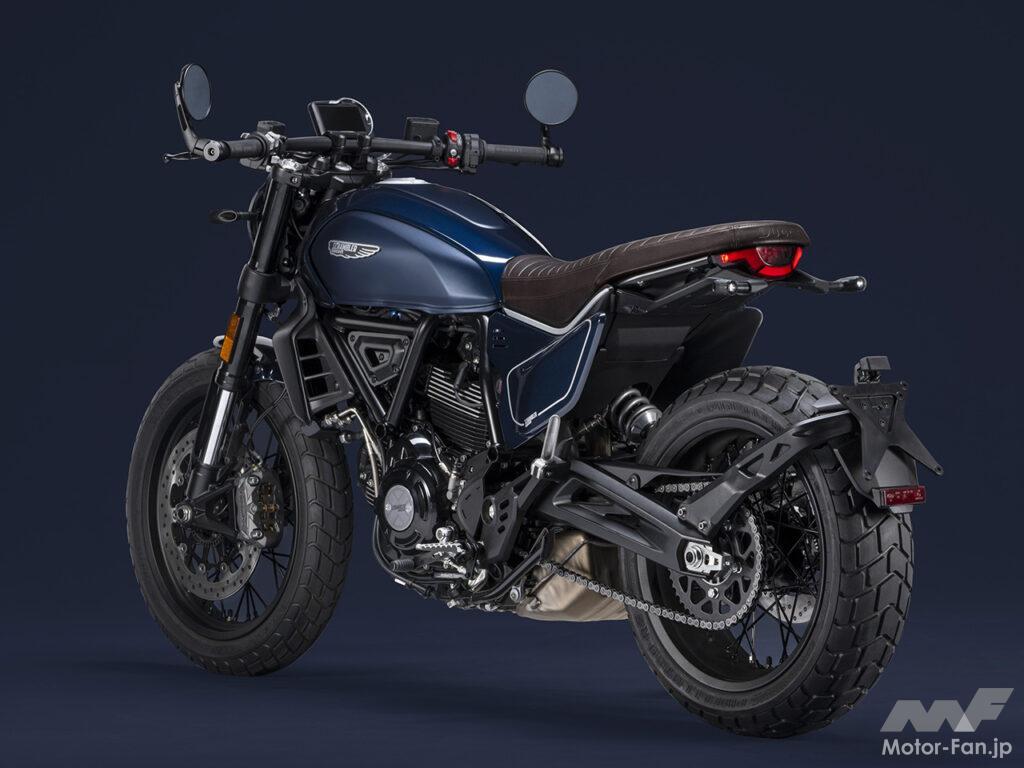 空冷4ストロークL型2気筒803ccのデスモドロミック2バルブエンジンを搭載したモデルは、2019年モデルより登場。今回発表された2023年モデルは、タンクやテールのデザインを一新。また、シャシーのベースとなるトレリスフレームとスイングアームも変更された。