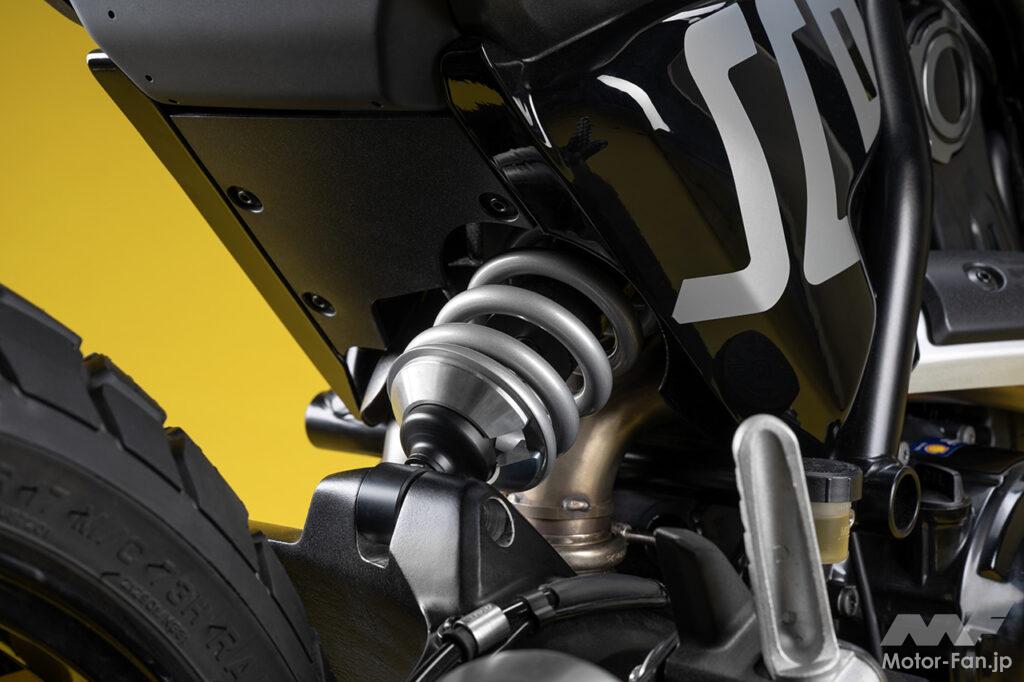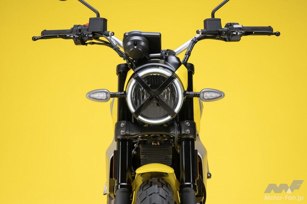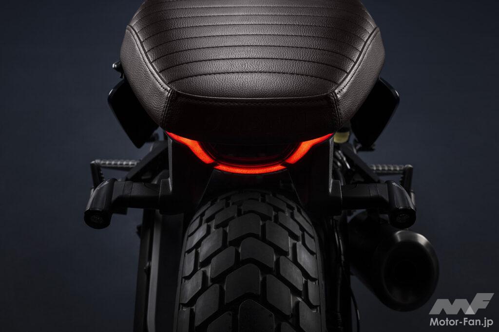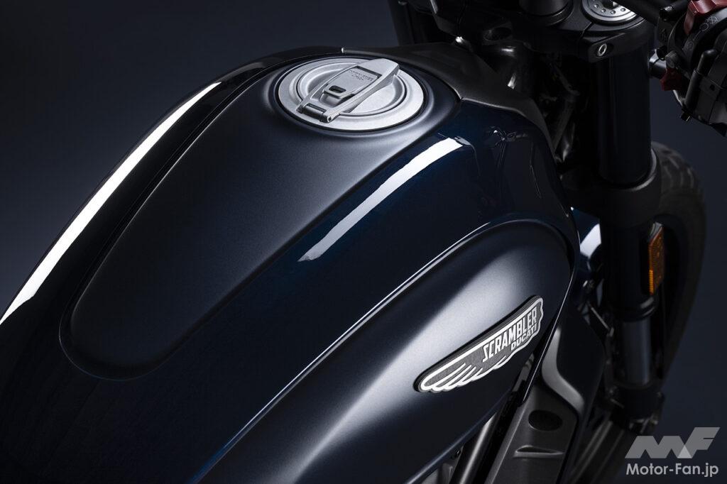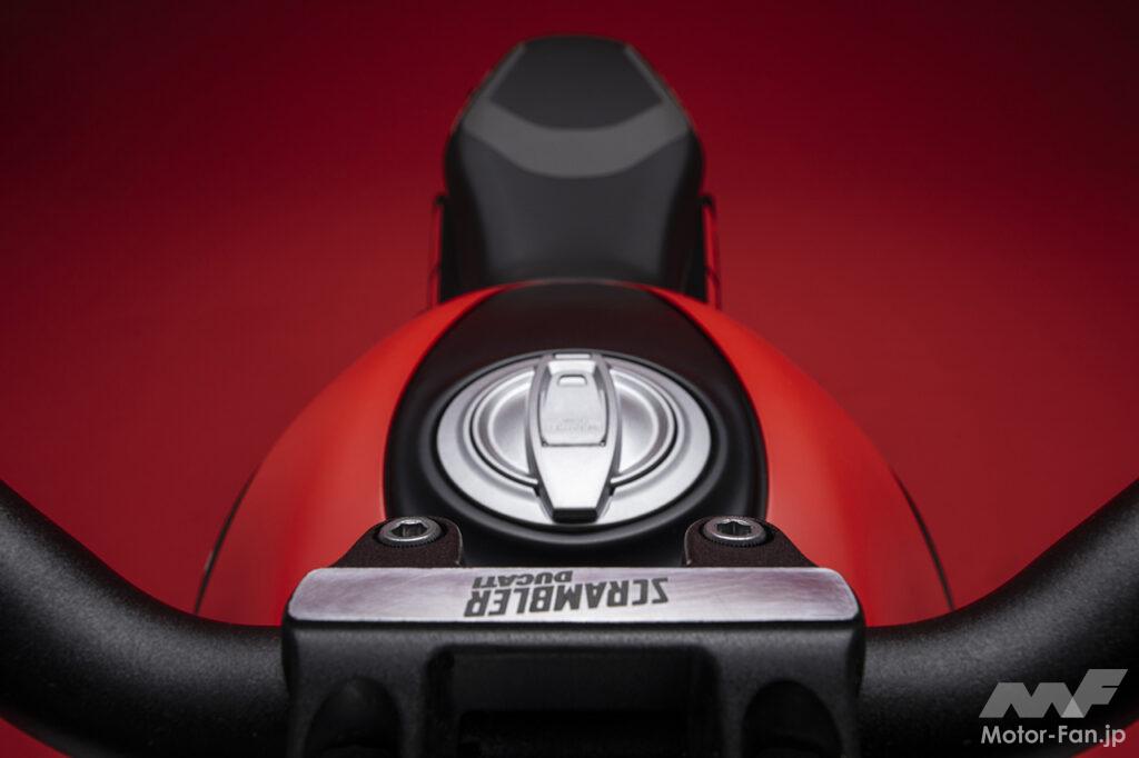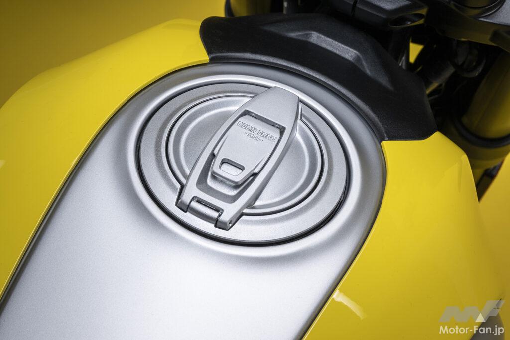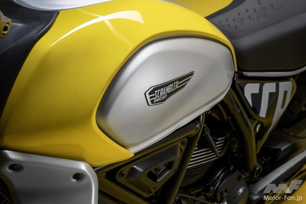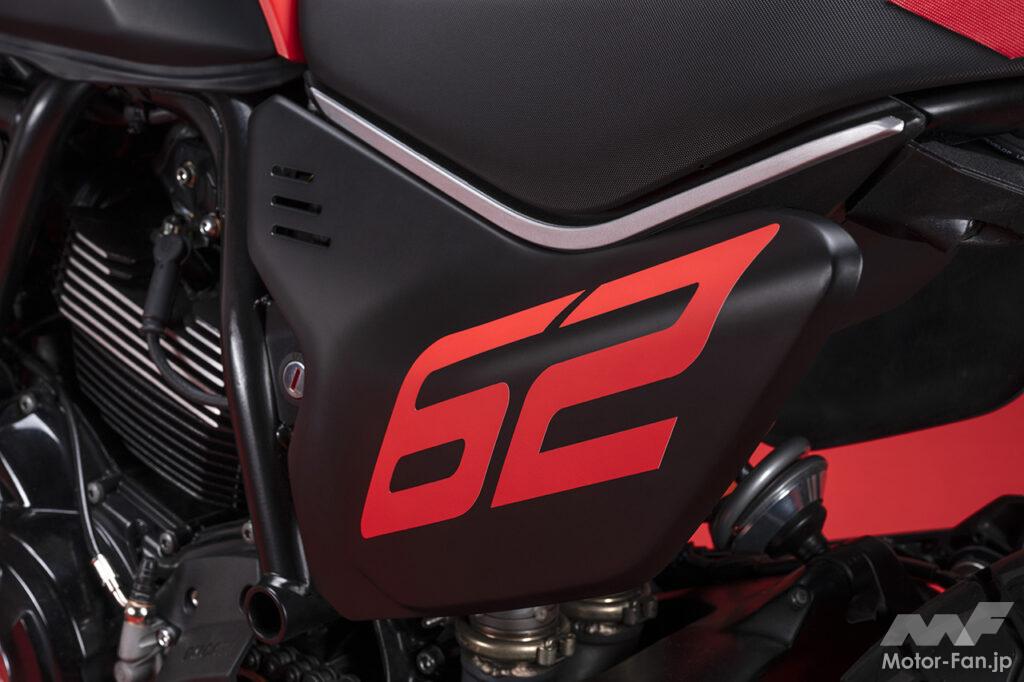 空冷4ストロークL型2気筒803ccのデスモドロミック2バルブエンジンを搭載したモデルは、2019年モデルより登場。今回発表された2023年モデルは、タンクやテールのデザインを一新。また、シャシーのベースとなるトレリスフレームとスイングアームも変更された。