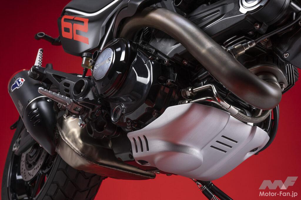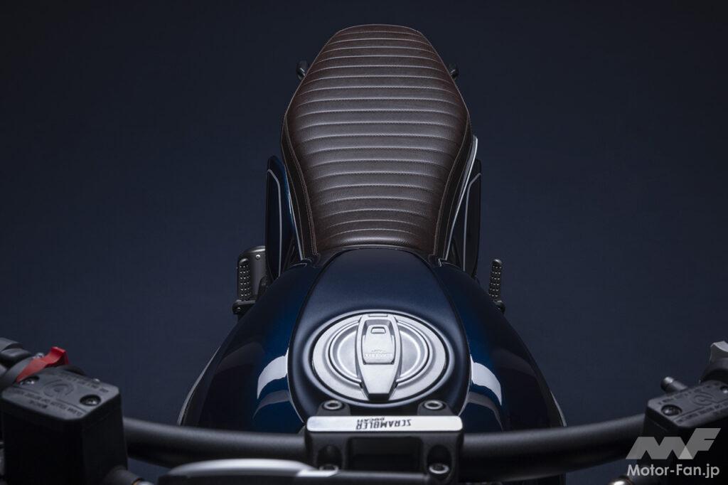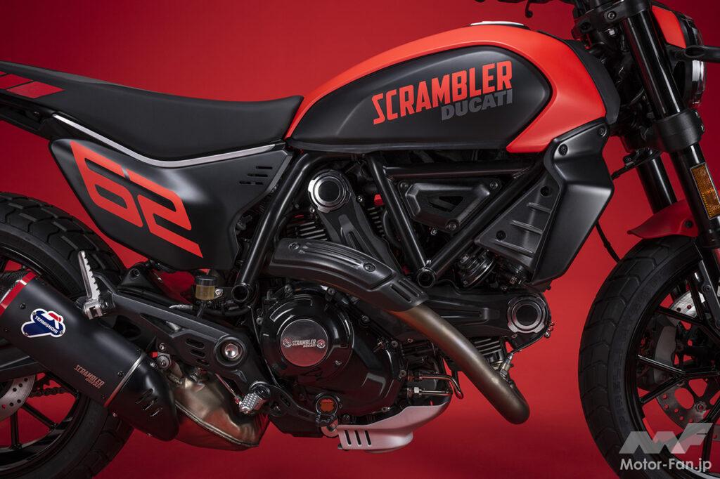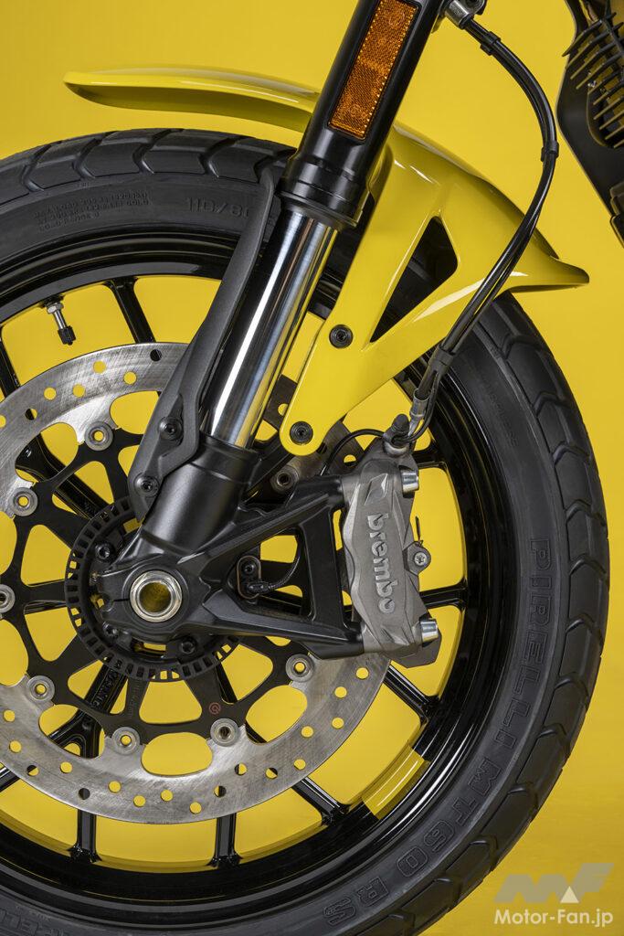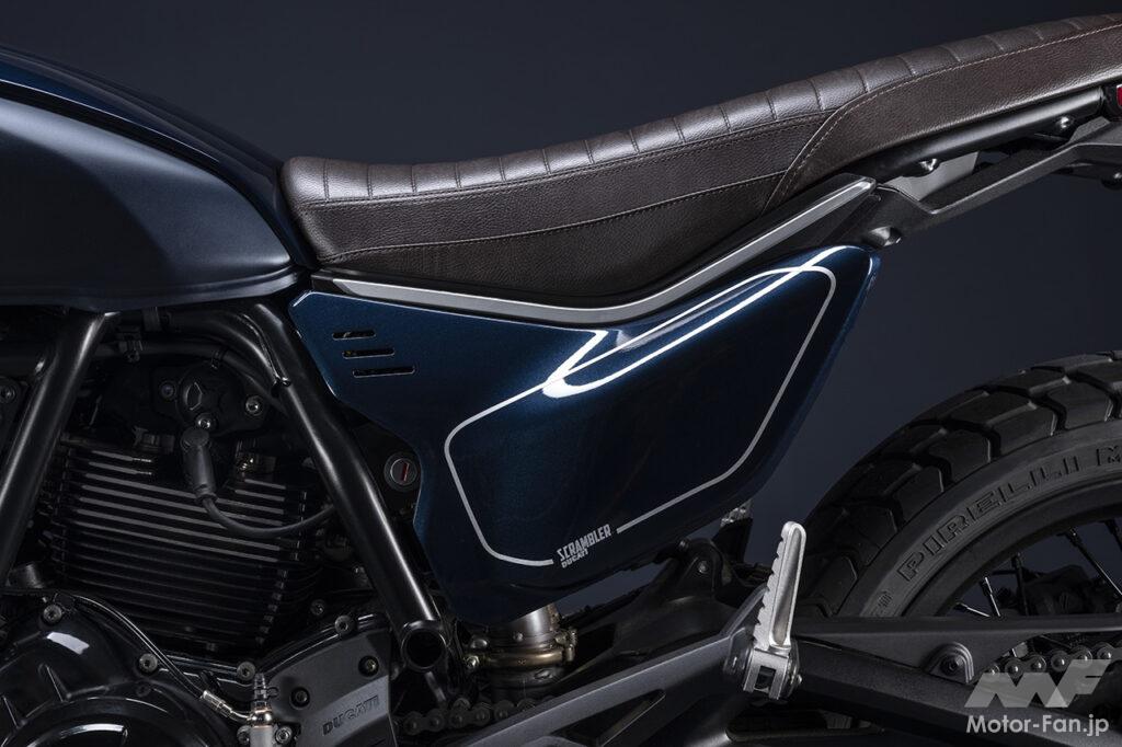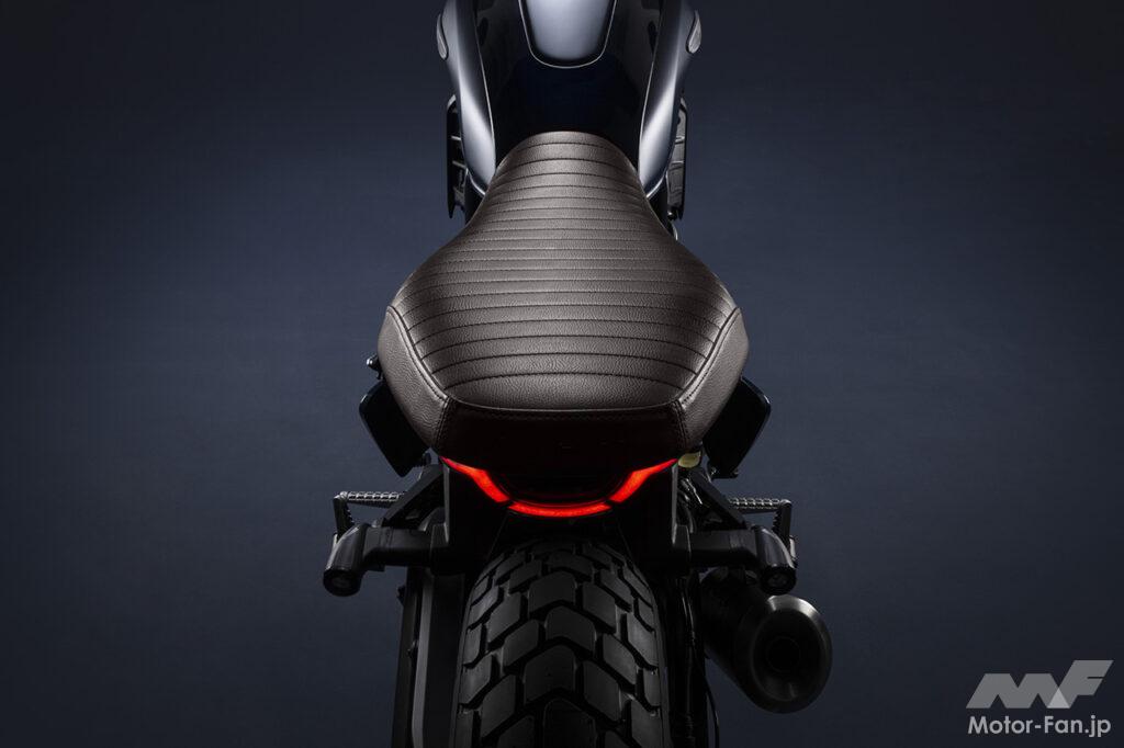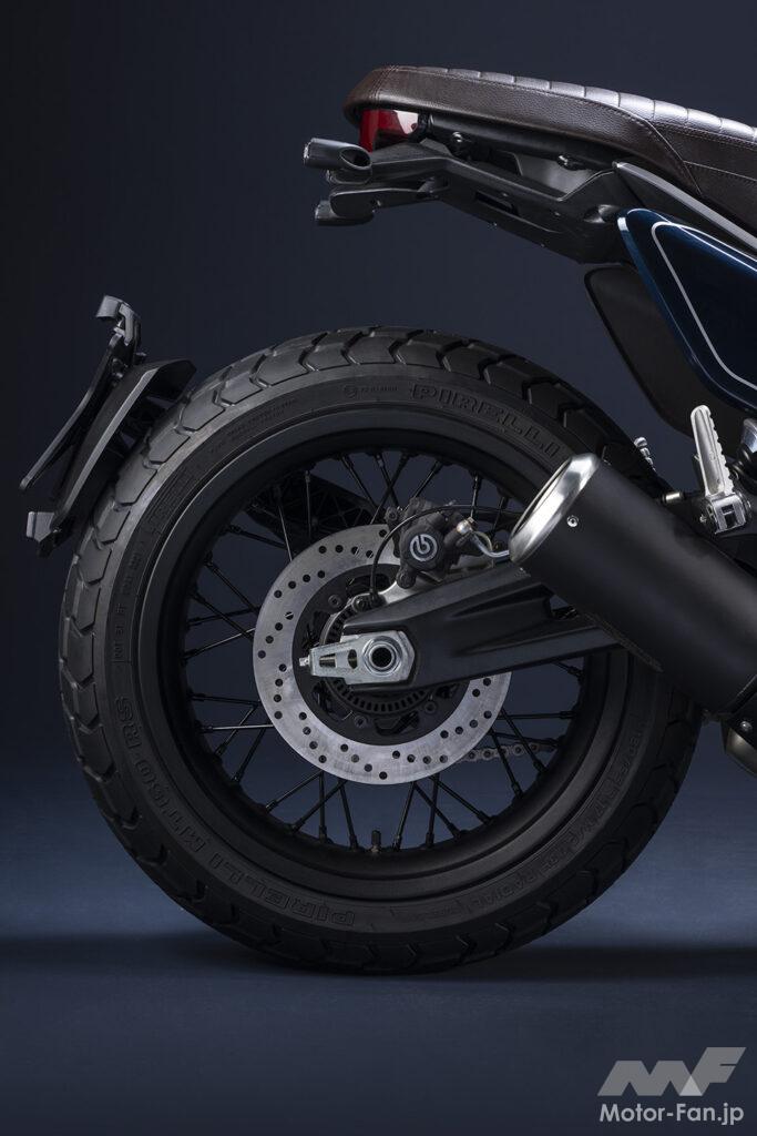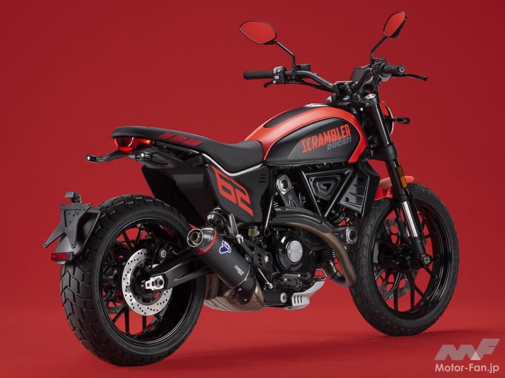 空冷4ストロークL型2気筒803ccのデスモドロミック2バルブエンジンを搭載したモデルは、2019年モデルより登場。今回発表された2023年モデルは、タンクやテールのデザインを一新。また、シャシーのベースとなるトレリスフレームとスイングアームも変更された。
