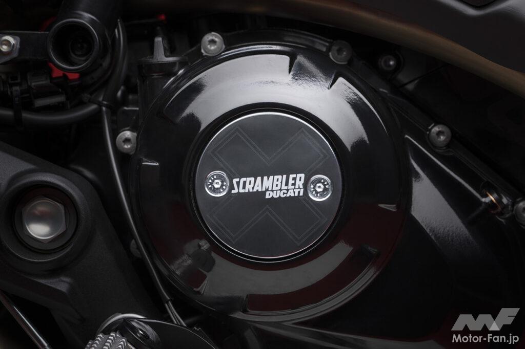 ドゥカティ伝統のデスモドロミックエンジンは細部を刷新。前モデルよりも約2.5kgの軽量化に成功し、各部のフリクションを低減してレスポンスを向上。また、「X」ロゴをあしらった新しいクラッチカバーなど、エンジン各部のカバー類を一新した。