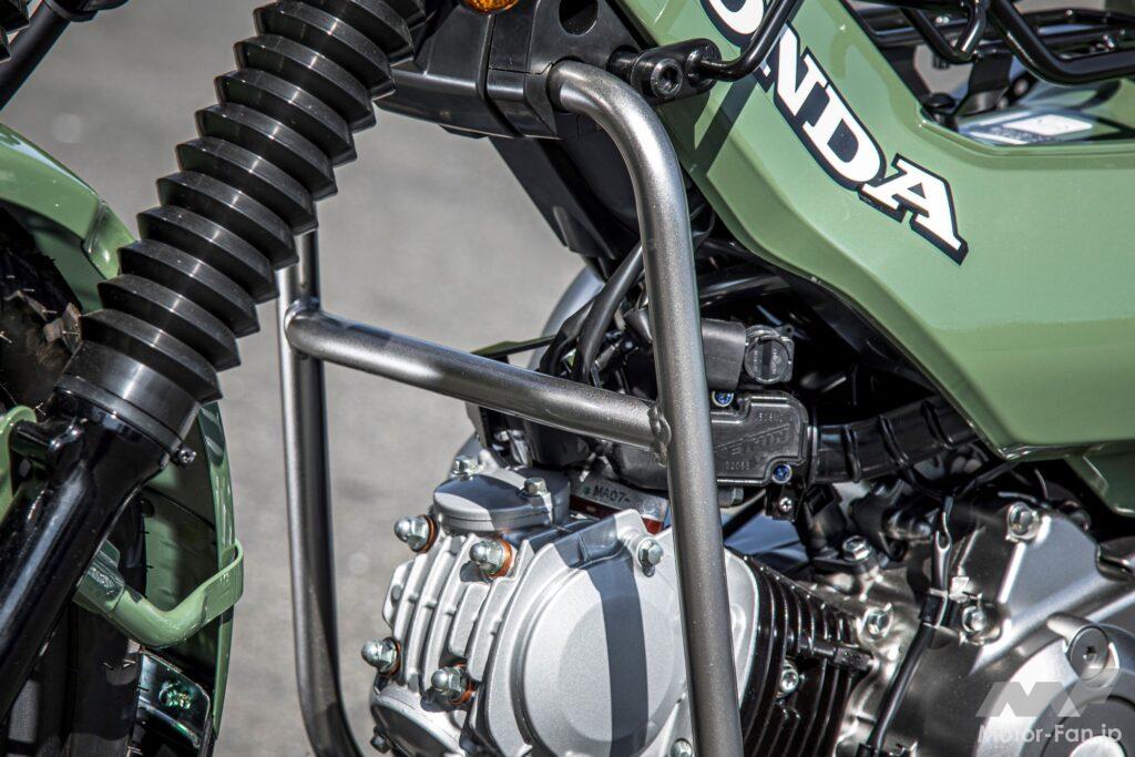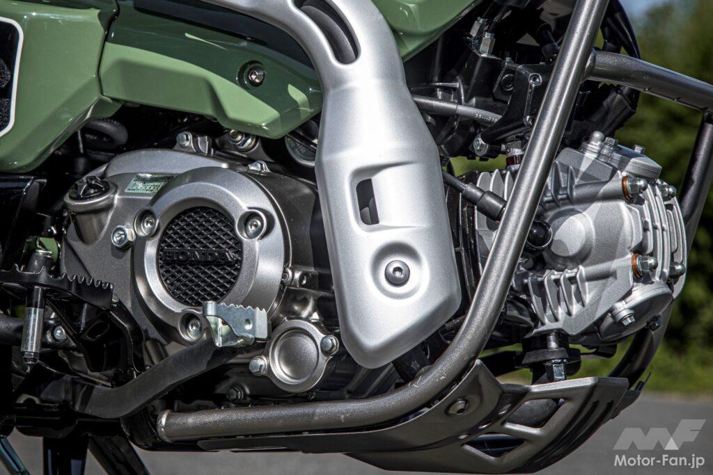 エンジンは空冷SOHC2バルブ単気筒で、φ52.4×57.9mmというボア×ストローク値からも分かるように、もともとロングストローク型のエンジンだった。2021年モデルのグロムから採用された新型エンジンは、ボアをφ50.0mmに縮小、ストロークを63.1mmに伸長しているのが特徴で、さらに圧縮比は無鉛レギュラーガソリン指定のまま9.3:1から10.0:1へと高めている。機種によってスペックは異なるが、CT125・ハンターカブの場合は最高出力が8.8ps/7000rpmから9.1ps/6250rpmへと微増。最大トルクは11Nmのまま発生回転数が4500rpmから4750rpmへと変化している。