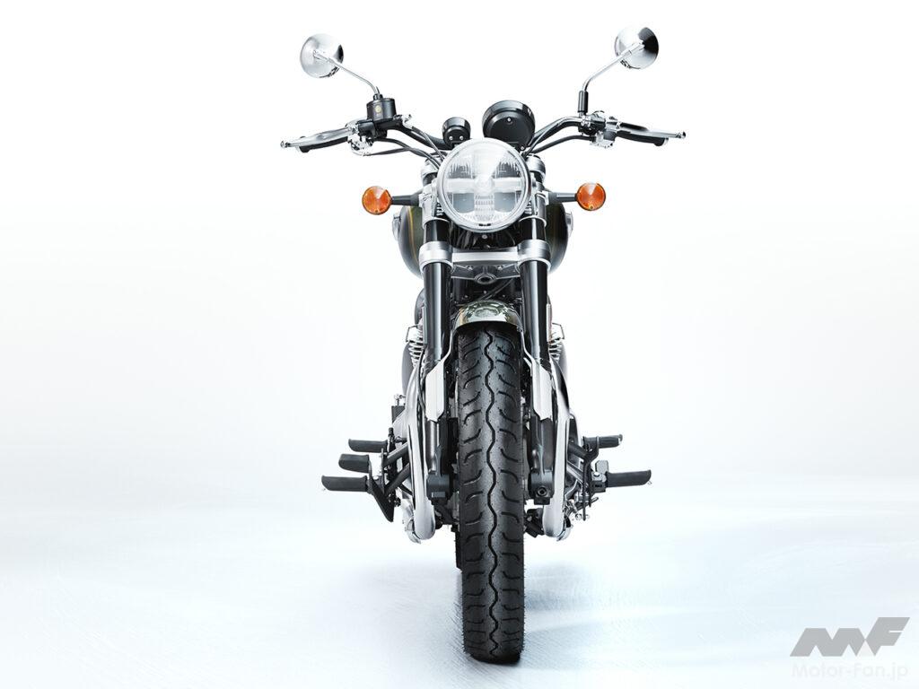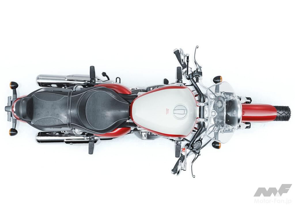 卓越した造形美を誇るフィン付きの空冷エンジン、ゴージャスな雰囲気の左右2本出しのメッキマフラー、滑らかな曲線を描く存在感の高い外装パーツ、150mm幅のワイドなリアタイヤ、全長2260mm・ホイールベース1500mm・装備車重241kgのビッグサイズにより、その姿は“鉄馬”と呼ぶにふさわしい堂々たるもの。