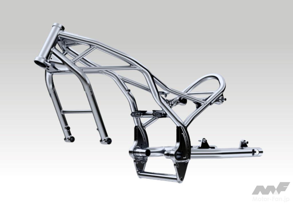 レブルシリーズ一連のスタイリングが採用されたが、下の写真で示す通りスチール製丸パイプでデザインされたダイヤモンドフレームのメインパイプはφ35mmサイズ。ロング・スイングアームもスチール製のφ50.8mmと高剛性を追求した太いサイズで仕上げられた。