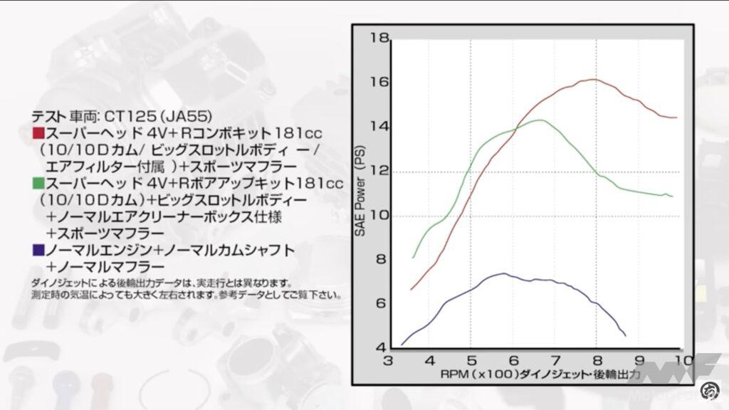 純正の124ccから181ccにボアアップするだけでノーマルとは比べものにならないほどの出力が手に入るなる。ところが今回のキットでは吸排気バルブがそれぞれ2つずつある4バルブヘッドが組み合わされている。これがどれだけの違いなのかは誰でもが感じられるほどのもので、今回は動画内でパワーチェックしたグラフを紹介している。一番下の線が純正でその上が181cc4バルブとしつつ美ッグスロットルボディとノーマルエアクリーナー、スポーツマフラーでの性能、さらに上がコンボキット付属のエアクリーナーにした結果だ。3仕様での違いは歴然で、コンボキット付属エアクリーナーを装着した状態では実に16psもの出力を実証している。