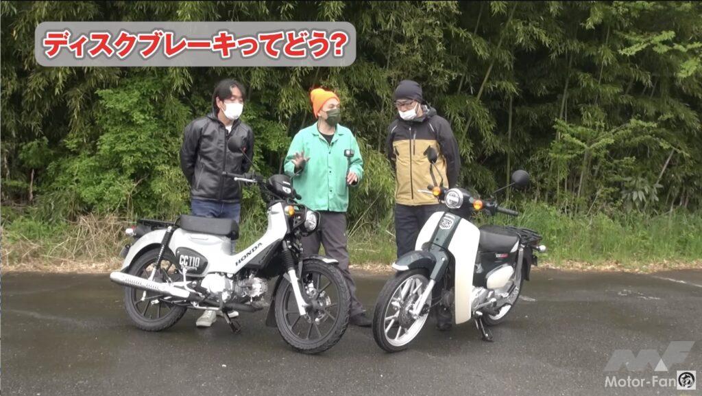 試乗を終えたケニー佐川を迎えて3人による新型の印象を語り合っている。ブレーキについては全員が賛辞を送っている。車間距離を空けがちだった従来のスーパーカブと違い、良い意味で車間距離を詰めることができる。これはディスクブレーキによる恩恵だ。また試乗した日が雨だったこともあり、明らかにドラムブレーキのような滑る感覚はなくダイレクトにブレーキが効いてくれることを実感。ABSについても触れていて、作動した時のフィーリングが自然で尚且つしっかりと止まってくれる。