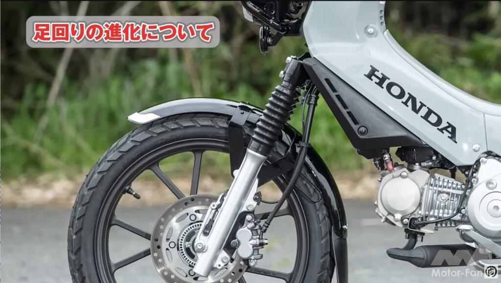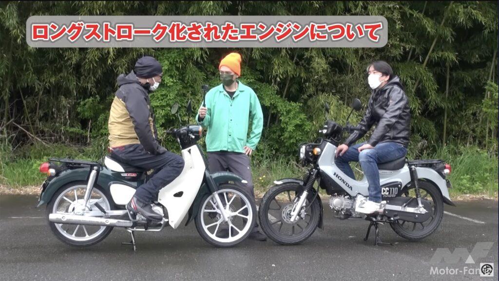 走り出しから「気持ち良い!」と語り始め、新型エンジンが明らかにパワフルでスムーズなマナーを備えていることが感じられている。また回転の伸びだけでなくエンジンブレーキのかかり具合も洗練された印象。またシフトチェンジ時のショックが穏やかになった印象で、クラッチの繋がり具合も絶妙。ロングストローク型になった新型エンジンは排ガス規制をクリアすることが目的なだけでなく、これからの時代を走るカブにふさわしい進化となっている。また足回りについても触れていて、キャストホイール&チューブレスタイヤになったことで路面からの入力を高い剛性感とともに伝えてくれ、コーナリング時の安定感まで増している。試乗の最後は「普通のバイクみたい」と締め括っている。
