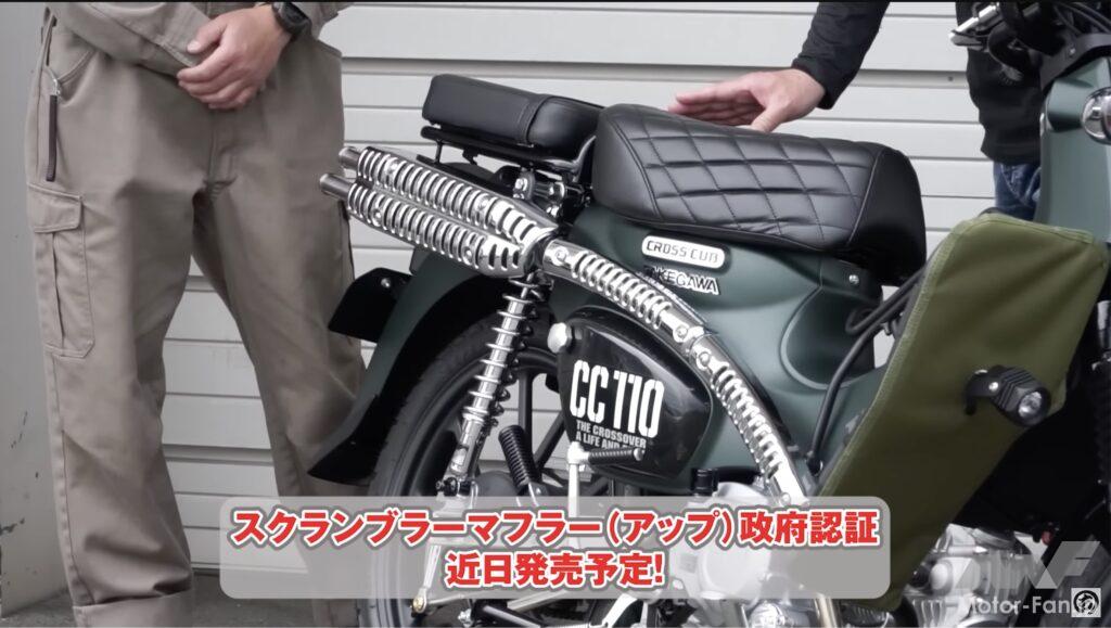 クロスカブ110のコンプリート車で一番の見どころがアップタイプのマフラーだろう。従来のドラムブレーキ仕様JA44クロスカブにも用意されていたスクランブラーマフラーだが、新型となってエンジンが変わったことに対応させてきてくれた。CL72スタイルのレトロ感あるスタイルは変わらず、新型エンジンに装着可能なように開発されたのだ。動画制作時には近日発売予定だったが、すでに発売されていて価格は5万4780円(税込)となっている。