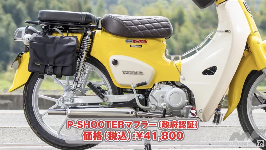 まず紹介したいのが新型スーパーカブ110用のカスタムパーツたち。排ガス規制に対応させるためロングストローク仕様のエンジンになったということは、従来のドラムブレーキ仕様カブ110用マフラーが使えないということ。新製品が待たれているわけだが、早速リリースされたのがキャプトンタイプのP-SHOOTERマフラーだ。もちろん音量や排ガスは基準をクリアしているので、安心して使えるマフラーなのだ。