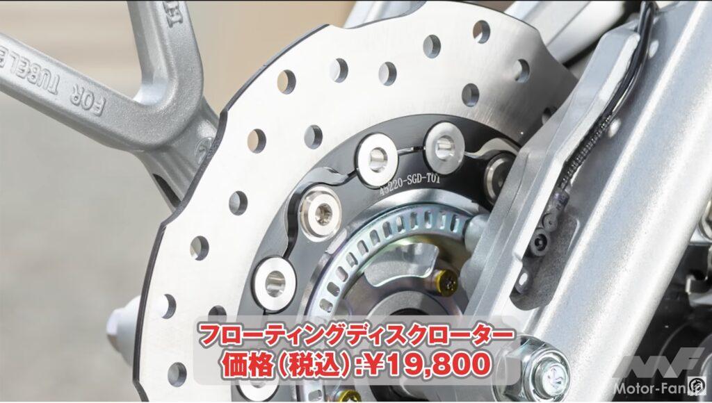 機能面ではディスクブレーキの性能を向上させてくれるパーツから紹介したい。待望のディスクブレーキ装備では、純正だとソリッドタイプのディスクローターに1ポットキャリパーが採用されている。いきなりキャリパー交換となると敷居が高いが、純正キャリパーのまま制動性能を向上させてくれるディスクローターが開発されたのだ。純正のソリッドは熱による影響で摩耗面の精度が低下してしまうことがある。そこでSP武川ではフローティングタイプのディスクローターを開発して熱歪みによる影響を最小限にすることに成功した。動画制作時は価格未定だったが、現在は2万2000円(税込)で販売されている。またツーリングユーザーから絶大な支持を集めそうな専用スクリーンキットも新開発。こちらはまだ価格未定だが、専用だけあってジャストフィットしている。