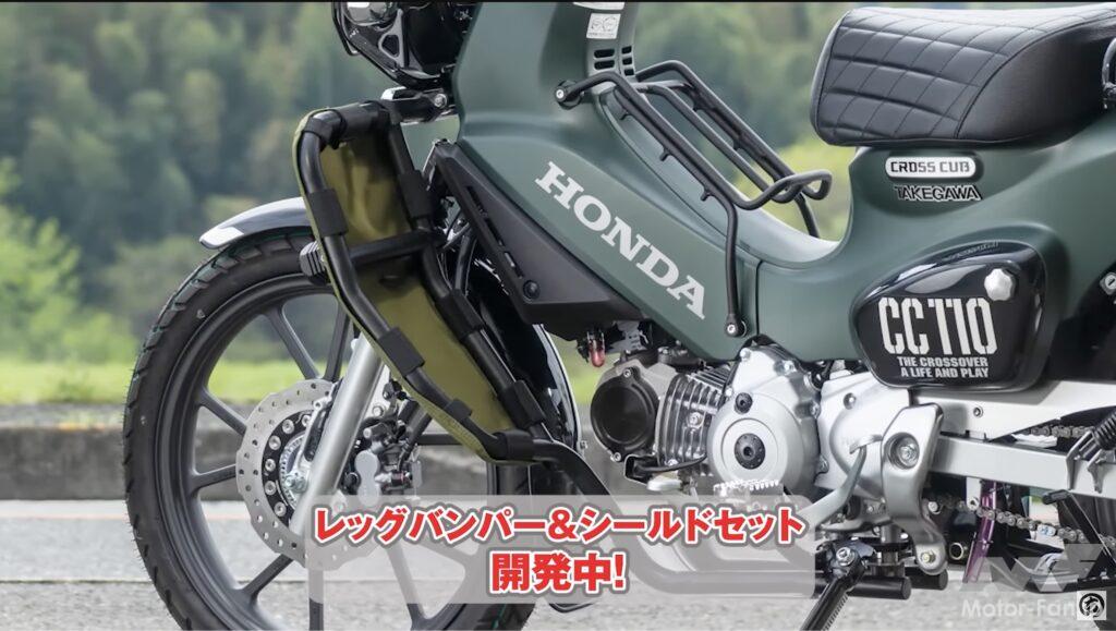 スタイル上で最も効果的なアイテムはレッグバンパー&シールドセットだろう。スーパーカブ一族らしくレッグシールドのような効果とルックスを演出してくれるアイテムで、より大柄に見えることからも発売が待ち遠しい逸品。レッグバンパーにはLEDフォグランプキットが装着可能で、純正ヘッドライトだけでは頼りない場面で大活躍してくれるはず。またレッグバンパーに取り付けるシールドは写真のグリーンのほかブラック、グレー、迷彩柄が用意されている。好みのスタイルに合わせて選びたいポイントだ。