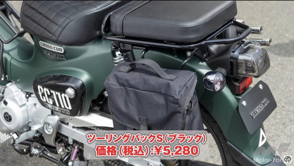 コンプリート車にはフロントキャリアキット(1万780円・税込)やアルミセンターキャリアキット(1万5180円・税込)なども装着されているが、やはり注目はリヤキャリアに追加するサイドバッグサポートだろう。こちらはスーパーカブ110用と同じ製品で価格も1万3200円(税込)と変わらない。ただ、アップタイプのスクランブラーマフラーを装着すると車体右側面に取り付けることができなくなるため、クロスカブ用としては左側面のみのラインナップとなっている。またツーリングバッグSもスーパーカブに装着してあるものを同製品だ。このほかスモークレンズのテールランプやウインカーなども装着したことで、リヤのルックスを大きく変えている。新型カブ110を購入予定の人も、すでに納車されている人も、大注目の製品群なのだ。