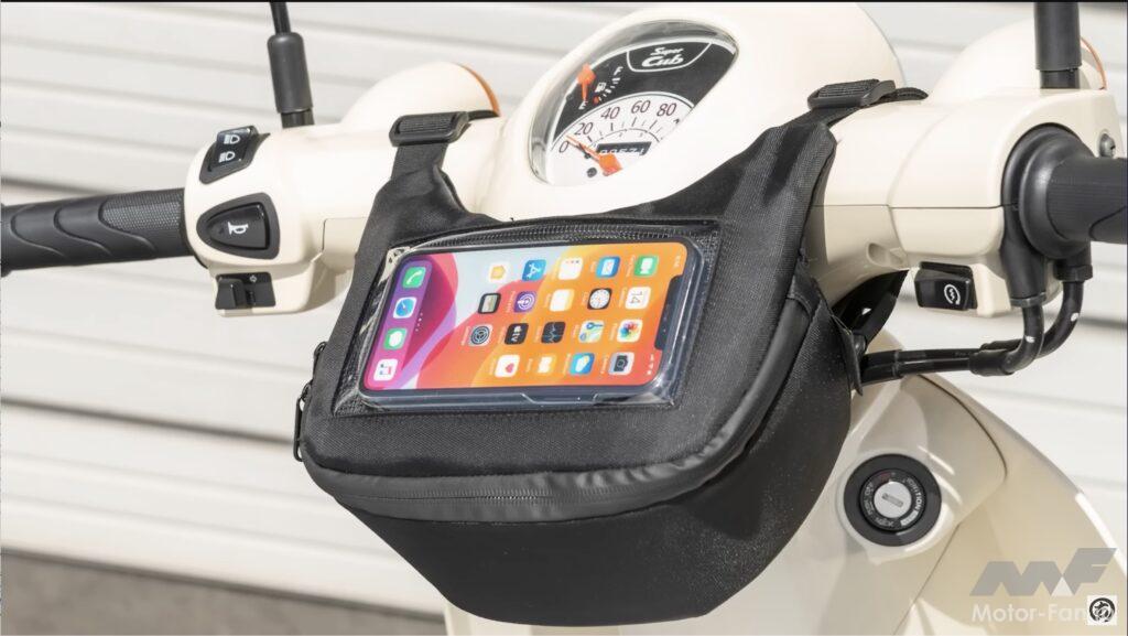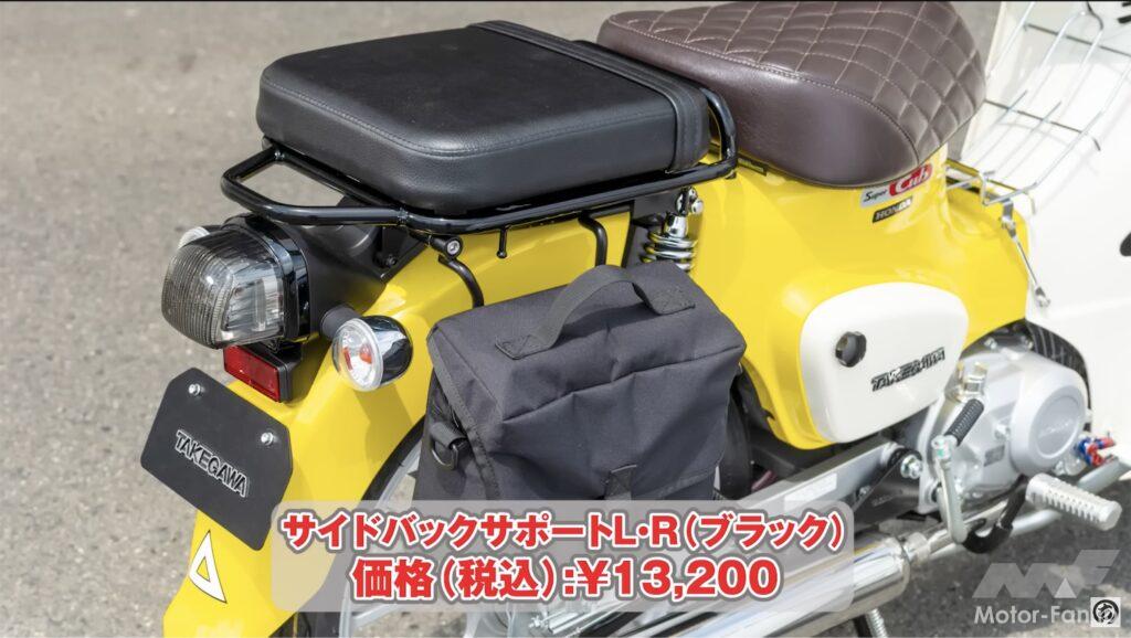 積載性を高めるカスタムパーツも数多くリリースされている。定番のセンターキャリアだけでなく、ハンドルカウルに装着できるツーリングバッグは大注目な製品。上面に特殊フィルムを採用することで内部に収納したスマホのタッチパネルを操作することが可能。また取り外したらウエストポーチやショルダーバッグとして使えるような設計になっているので、休憩する時にはバッグを外して持ち運ぶことも可能だ。またリヤキャリアに追加してサイドバッグがタイヤに巻き込まれることを防止するサイドバッグサポートも欲しいところ。スーパーカブ用には左右ともに装着が可能で、片側のみだと写真にあるよう1万3200円(税込)だがLRセットだと2万6400円(税込)になる。またキャリアに載せるピリオンシートやクッションシートカバーを組み合わせてルックスと機能面両方を向上させることができるのだ。