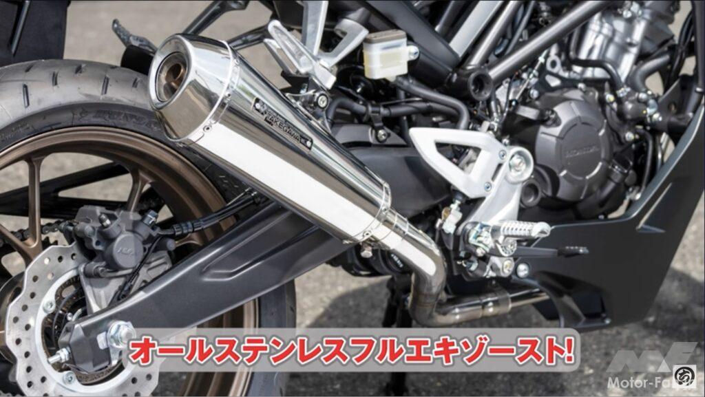 モトチャンプが誌面で伝えきれない最大の要素が「音」だ。雑誌は当たり前のことだが紙に印刷する以上の情報は盛り込めない。そこでモトチャンプTVでは積極的に「音」を紹介している。CB125Rに装着されたSP武川のテーパーコーンマフラーが一体どのような音になるのかも注目ポイント。実際の音は動画でしか紹介できないが、歯切れの良い単気筒らしさを強調した音質になっていることをお伝えしよう。また交換するだけで0.6馬力アップするテーパーコーンマフラーはエキゾーストからステンレスを採用しているため、軽量化にも貢献する。高級感あるルックスまで手に入るので、ぜひ装着したいと思えるパーツだ。