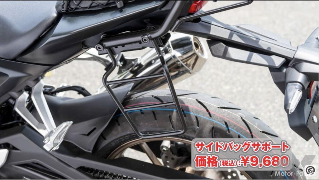 CB125Rはこのクラスとしては希少なフルサイズ・ネイキッドということで、走りの良さに特化したモデルといえる。走行性能だけでなくライダーの感性に訴えかける操縦性の良さが魅力なのだが、一方で積載性が犠牲になっていることも事実だろう。スリムなシートはスタイルだけでなく体重移動のしやすさやツーリング時の疲労度軽減に効果的だが、積載性は期待できない。そこで大型パニアケースにも対応するリアキャリアセットが開発された。しっかりとした強度を確保しているだけでなく、タンデムした時のグリップ性にも配慮された形状。またキャリアと同時に装着できるサイドバッグサポートがあれば、大小問わずバッグを固定してタイヤへの巻き込みが防止できる。これはツーリングライダーなら見逃せない装備だろう。コンプリート車ではアップタイプのマフラーを装着しているため車体左にしか付けていないが、純正マフラーなら左右に装着することが可能だ。