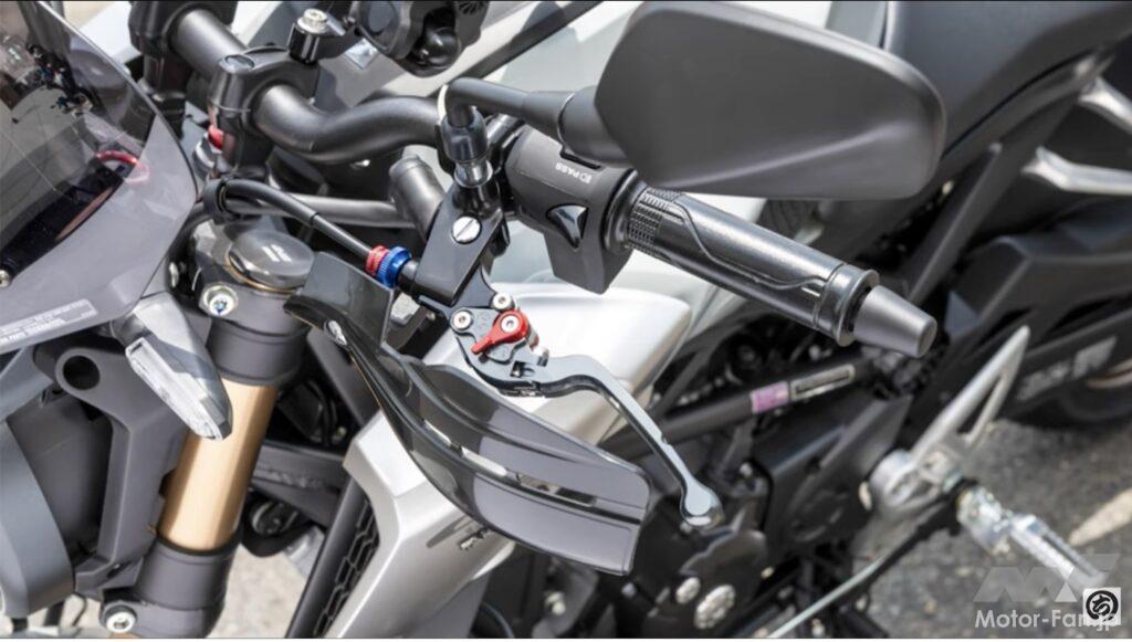 リアキャリアセットを使うほどではないという人にはグラブバーセットも用意されているので、コンプリート車のタンデムシートに付けられたツーリングネットを併用すれば十分な積載性が確保できるだろう。またタンクが樹脂製のためタンクバッグを付けられないCB125Rで欲しいのが、フロント側の積載性をアップできるパーツ。コンプリート車のハンドルに追加されたハンドルガードはスマホホルダーやヘルメットホルダーが装着されている。さらにこの状態でもイグニッションキーの抜き差しが邪魔にならないよう設計されているため、操作性に影響がないこともうれしいところだ。