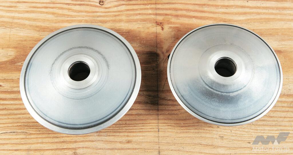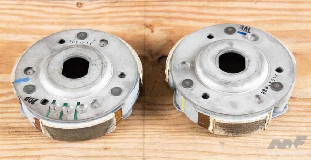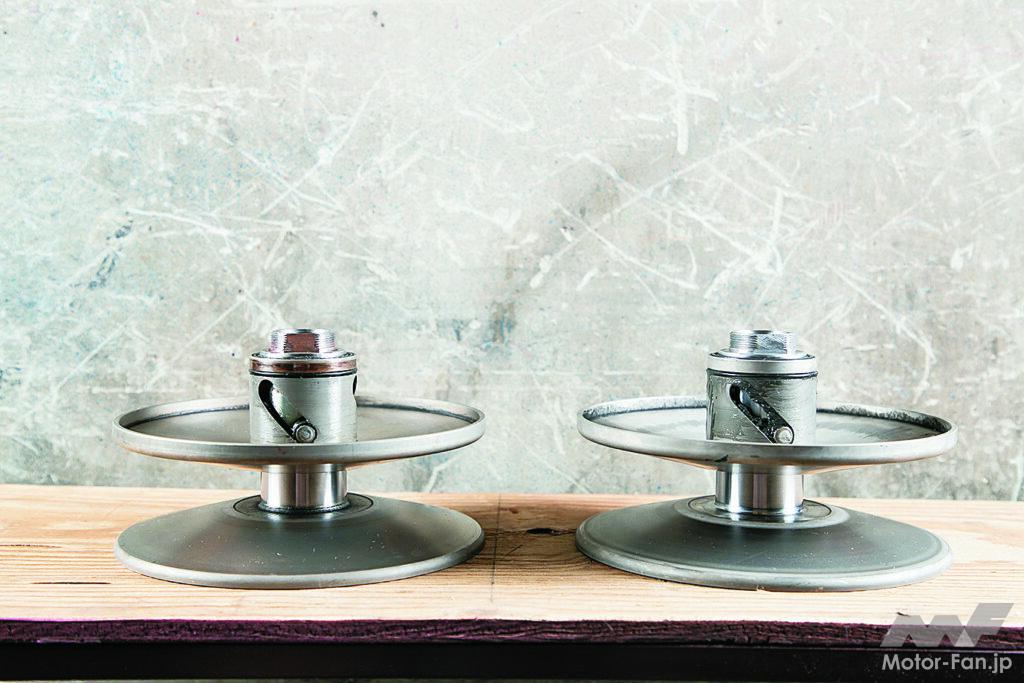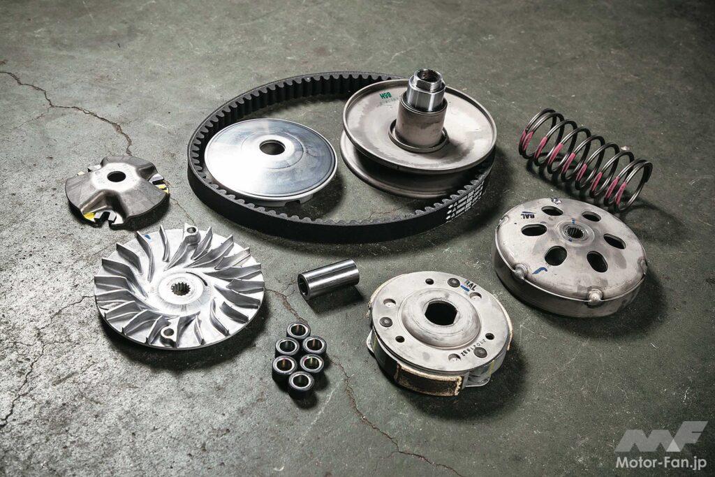 スクーターの速さを司る部分といえば駆動系。新型が登場するたびに気になるのが、それらの構成パーツが同じなのか、変わったのかという点。そこで新旧NMAXのパーツを比較したのが左の写真。結果を先にいうと、パーツの違いはあるものの性能的なポテンシャルは先代譲りで、駆動系チューンによるパフォーマンスアップも可能だ。