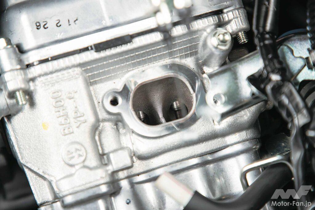 大径吸気バルブの採用により、ポートも拡大。より多くの混合気を取り込めそう。吸気マニホールドの切削具合(右)を見ればその差は歴然だ。先代モデルとは取り付けピッチも違う。